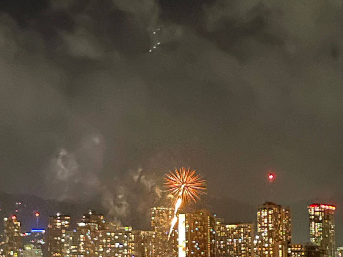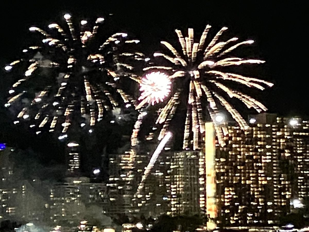 金曜日ヒルトンの花火は10分くらいで終わりました。マイタイ号はカクテル等飲み放題でわたくしはカクテル3杯飲みましたが、嫌な顔ひとつせず作ってくれました。