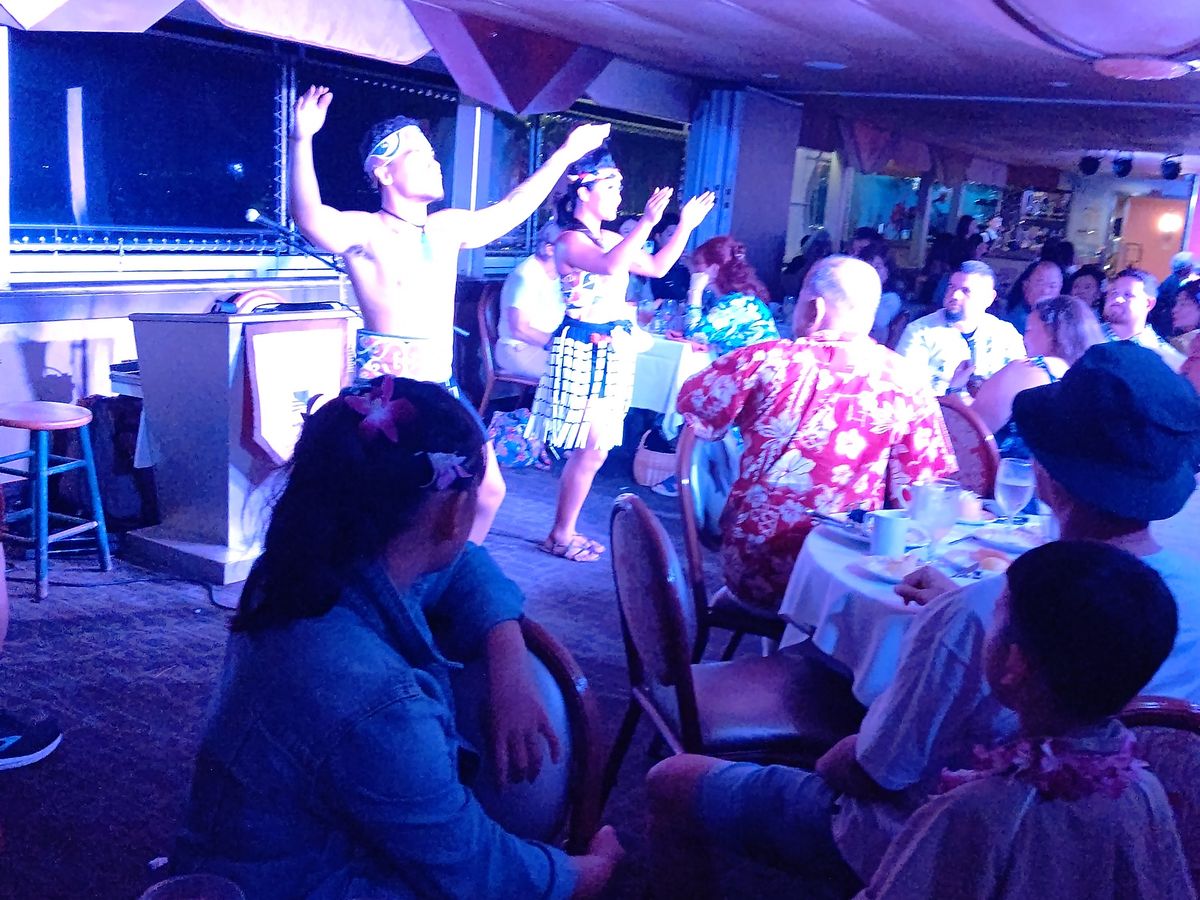 ショーはハワイアンのダンスショーで盛り上がり、舞台は一か所だけでなく会場内3か所で行われるため、同じ向きを見続けて首が痛くなることもない。