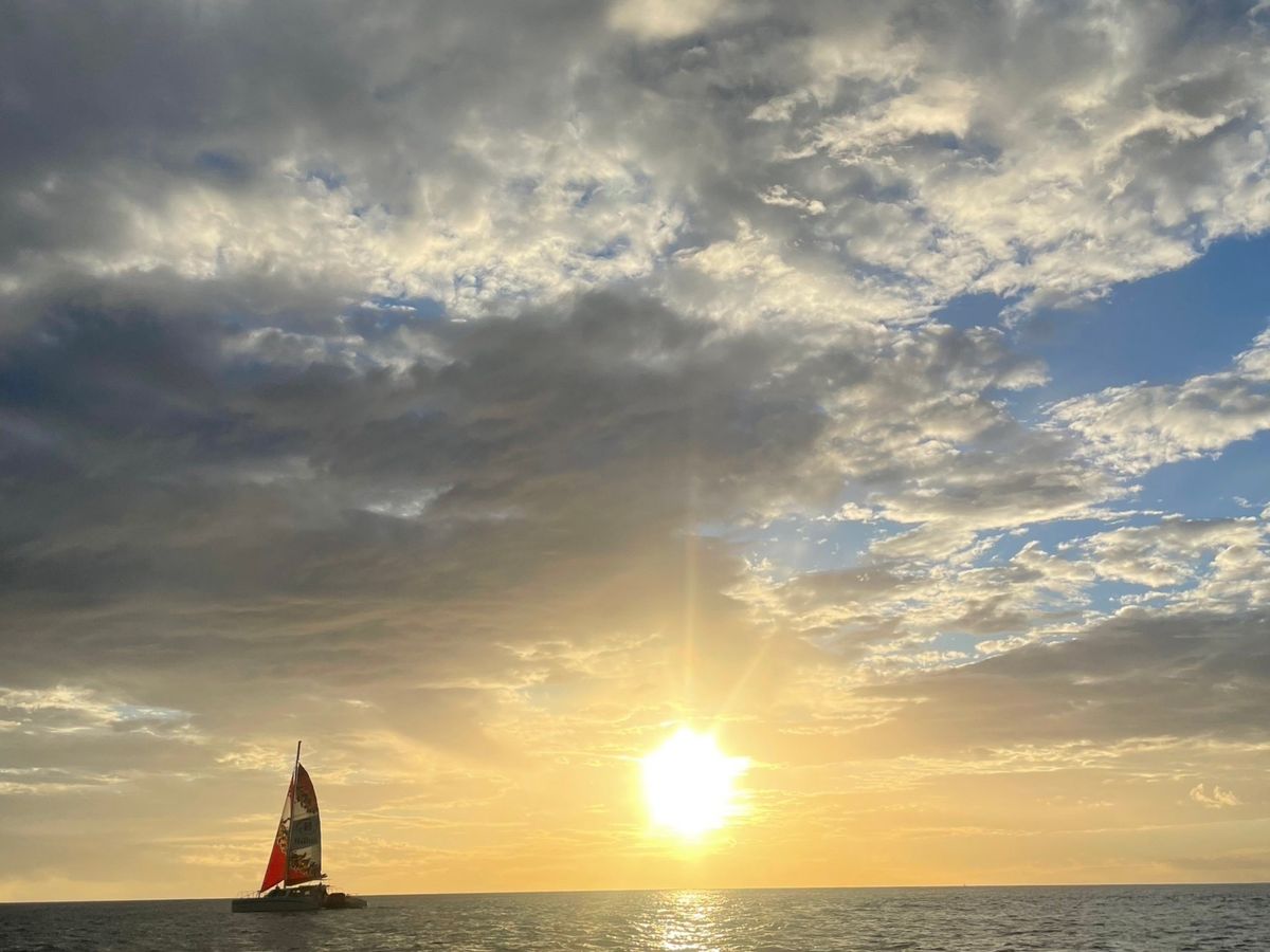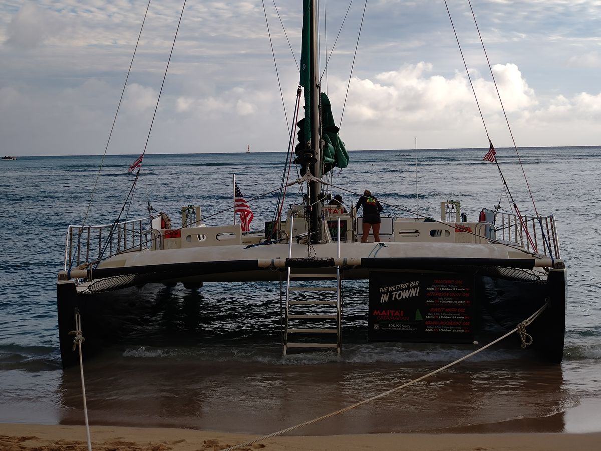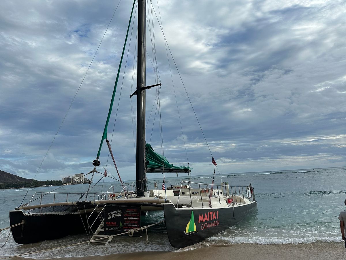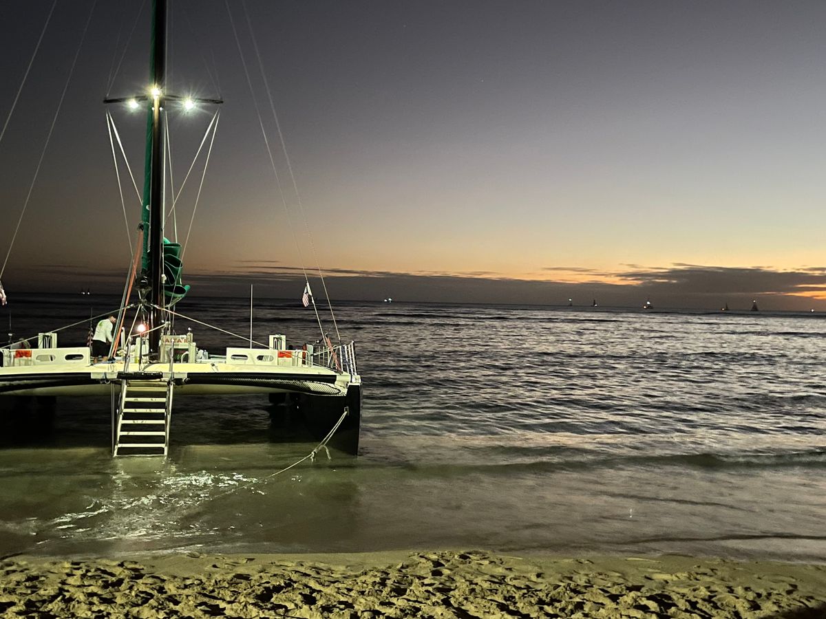 ディナークルーズなどで大型船に乗る事はあったが、セールと船外機つきヨットに乗せてもらう機会は滅多になく、カタマランという形式で、こりゃもうタマラン!今回初めての乗りでとても楽しい時間を過ごせました。皆様ずっと甲板にいて、風に吹かれ大型船と異なり波に揺らされる事も多いので、海に出ているという実感を味わえます。雲が多くて残念ながら夕陽を浴びる事はなかったものの、海から眺めるダイヤモンドヘッドやワイキキホテル群のイルミも又美しい。又、船に備え付けられているトイレにはビックリしました。マイタイの飲み過ぎには注意、酔ってマイッタします。ビーチからの出帆ですが、ハレクラニやシェラトン宿泊者以外はやや分かり難い場所が待ち合わせなので、事前に下見しておいてベター。マタイキタイと思わせしめるアクティビティだ。