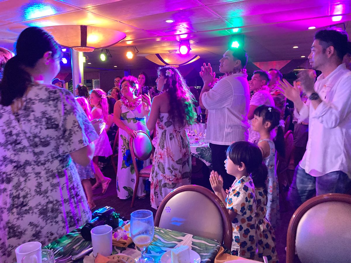 3.ステージでは歌と、フラ、男性の迫力ある踊りと盛りだくさんだった。トークが当然英語だけなので理解できず、面白さ大幅ダウン。最期に当月結婚記念日のカップルを登場させ、みんなで祝った。呼びかけが理解できたら我々も出たのに、と残念。