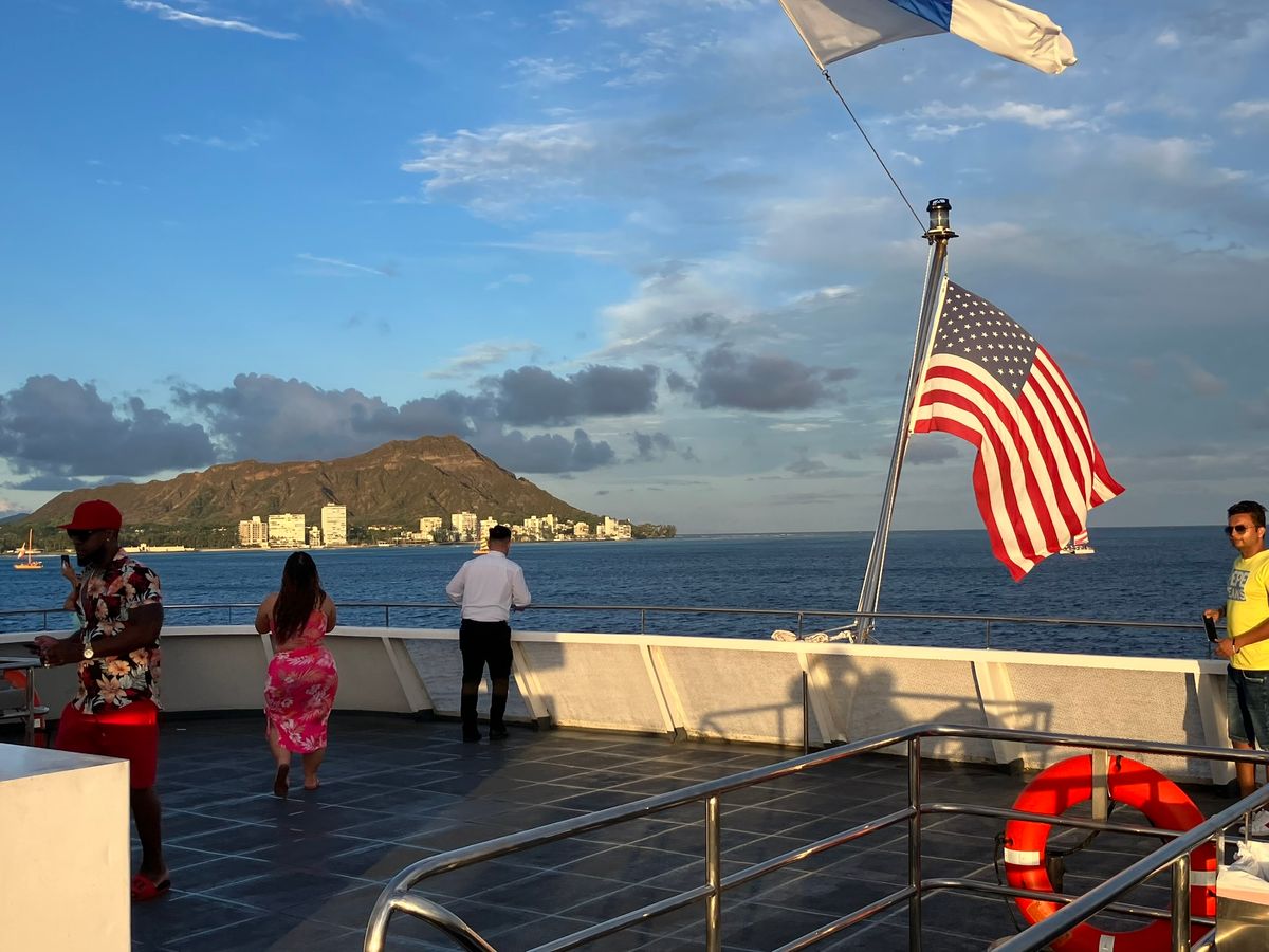 フラダンスやハワイアンを聞きながら、お隣の方とも写真を撮りっこしたりと楽しく過ごし、サンセットの時間にはデッキに行き、海風に吹かれてダイヤモンドヘッドを眺めたりと、最高の時間を過ごしました。