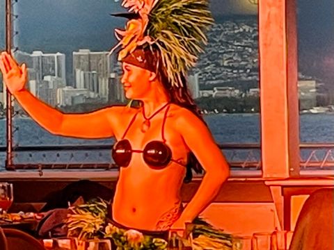 クルーズに乗ってからは、食事をして、ショーを見るといった流れです。 ショーはハワイの民族ダンスのようなものが間近で見れて圧巻でした。 また、ショーの開始前に当日誕生日の人、ハネムーンで来てる人は、挙手すれば面前で祝ってもらえます。