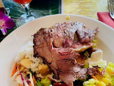 船内では、食べ放題ビュッフェがあり、ローストビーフやチキン、フルーツやスイーツと美味しく頂きました。飲み物はマイタイを。