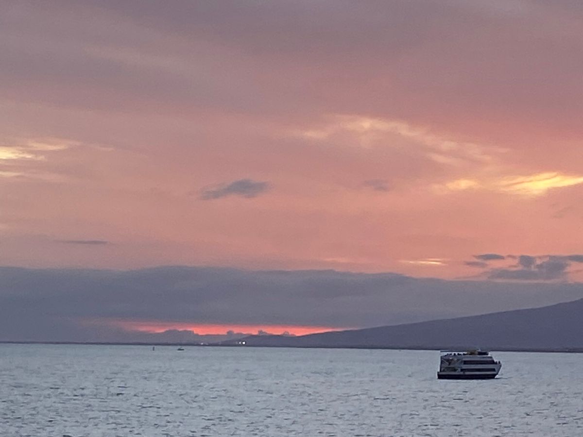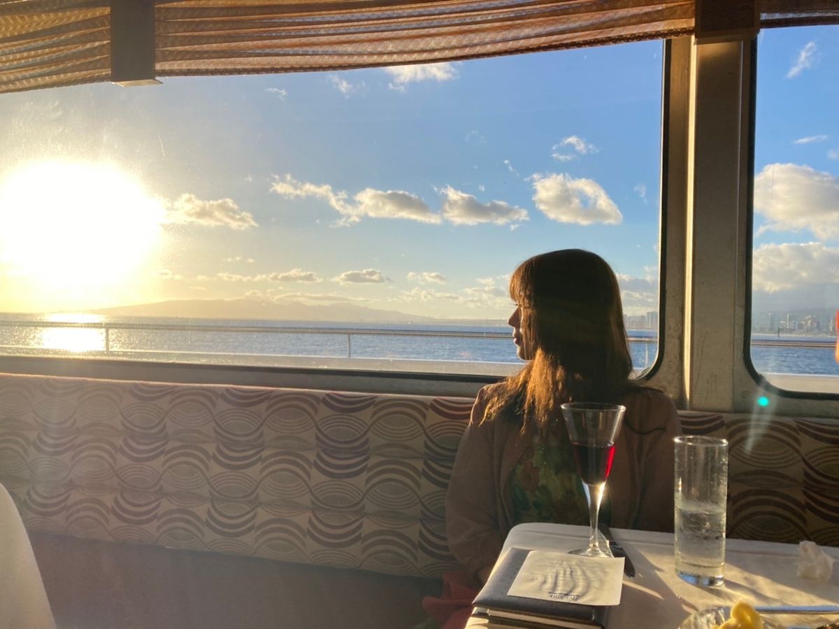 船内のテーブル席に案内され事前にもらった3枚の飲み物チケットを使い、最初はビールで乾杯。その後はお料理に合わせてシャンパン、赤ワイン、ウイスキーなどを頼みました。スープ、サラダ、ロブスター、お口直しのシャーベット、ステーキ、デザートを穏やかな揺れの中で頂きました。心配した船酔いなんて全然忘れて雰囲気に酔いしれた感じです。食事の途中で甲板に出て、サンセットやワイキキビーチ、ダイヤモンドヘッドを背に写真を撮ることも出来ました。周りはラブラブカップルや、家族や友人との特別なディナーを過ごしている感じで、隣との間隔も広くソーシャルディスタンスが守られていましたし、広い船内はゆったりしていました。