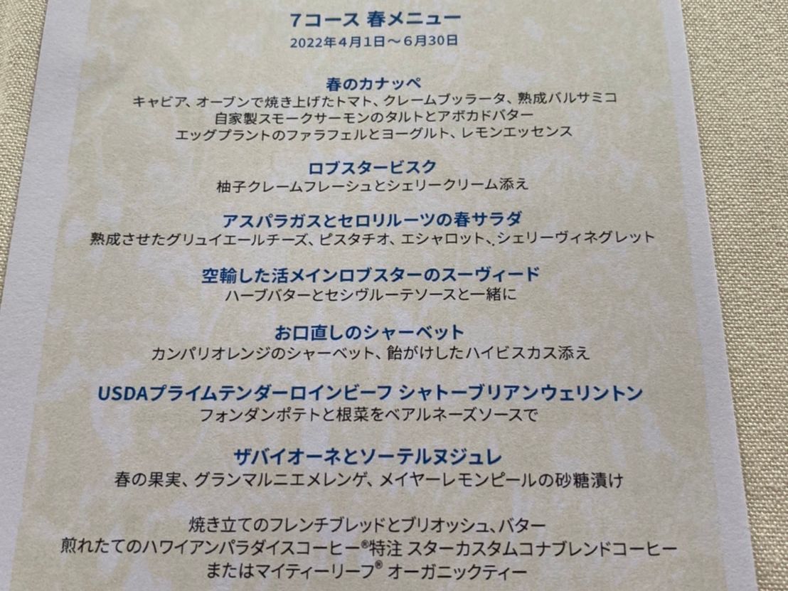 5スターはちょっと高いけれど、最上階デッキでのフランス料理は、感染対策ばっちりで、間隔が広くゆったりした相席なしのプライベート感たっぷりのシートなので、ゆっくり思い出の7コースディナーを楽しめます。それに1人当たり3ドリンクチケットが付くので、結局はお得かもしれません。ウェイターさんのマナーも完璧です。