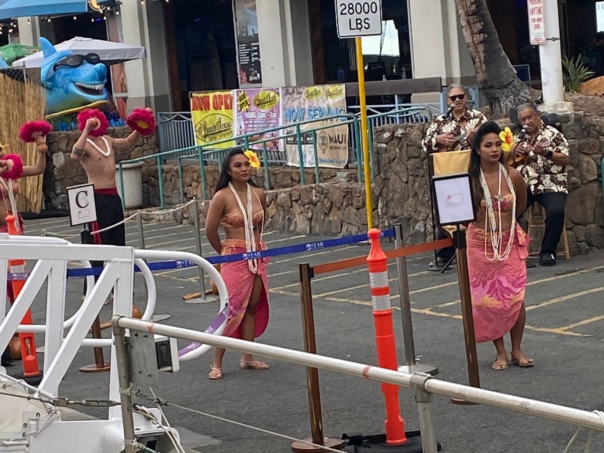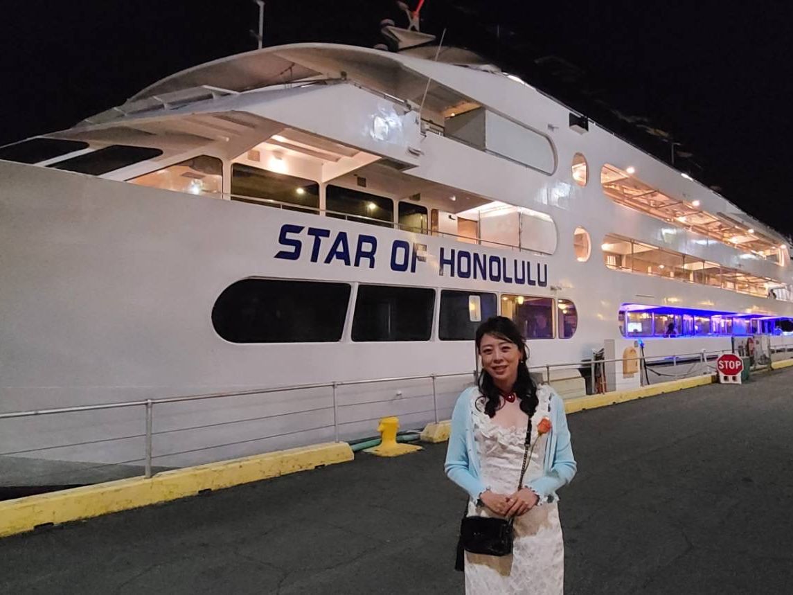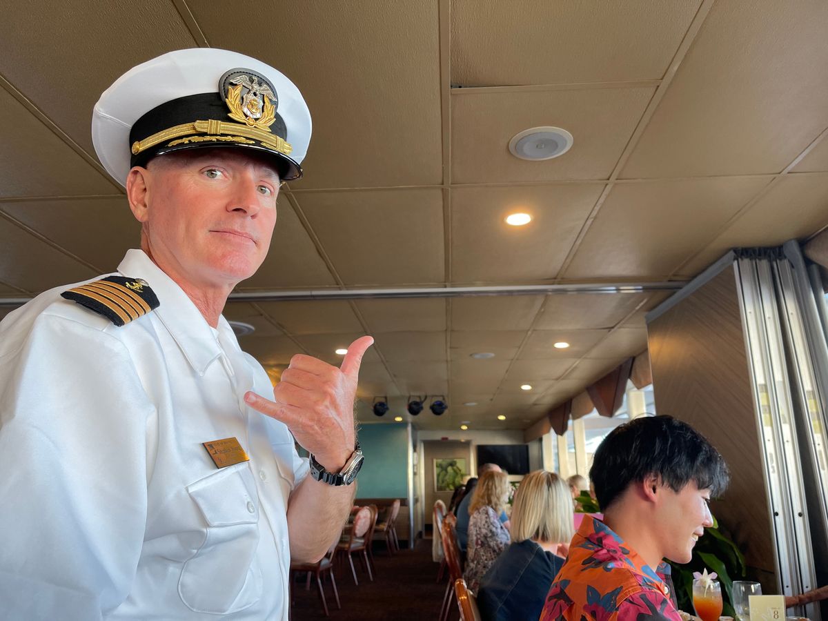 また、5スター専用デッキもあるので、食後にデッキで風に当たりながらカクテルを飲んだり思い出の写真を撮ったりもできます。フラを見て、ジャズを聞きながら陽が沈むのを眺めるロマンティックなディナーを満喫できます。帰りには女性にバラの花をプレゼントしてもらって嬉しかったです。船長さんとの写真撮影や、船長さんの挨拶も5スターならでは!