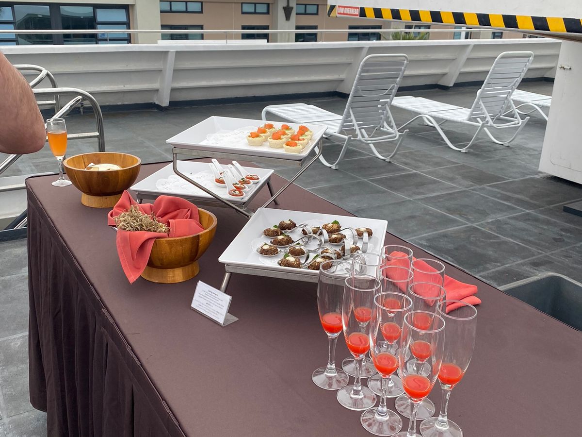 5スターは最上階の4階に案内され、船長やスタッフの方々が出迎えてくれます。デッキに出てウェルカムドリンクやワンスプーンの食事で歓迎を受けます。船長との写真撮影がありました。帰り際に27ドルで購入できます。(ほとんどの方が購入しているように見えました)