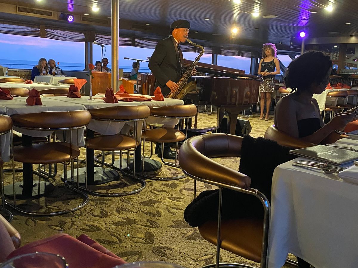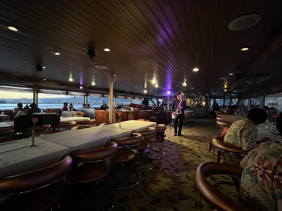 終始ピアノやサックスのジャズの生演奏があり、特別で素敵な時間でした。途中で再度デッキに出てサンセットを眺めたり、写真を撮ったりもできます。