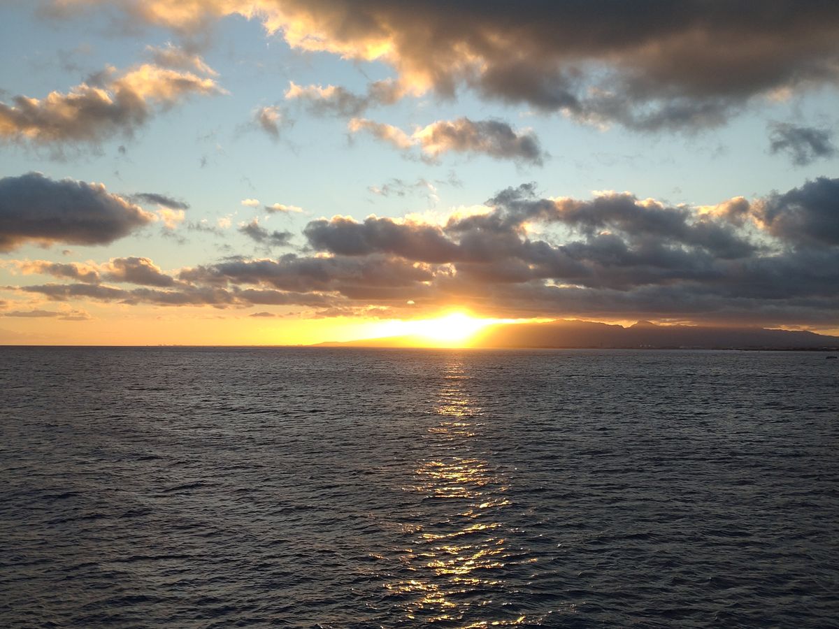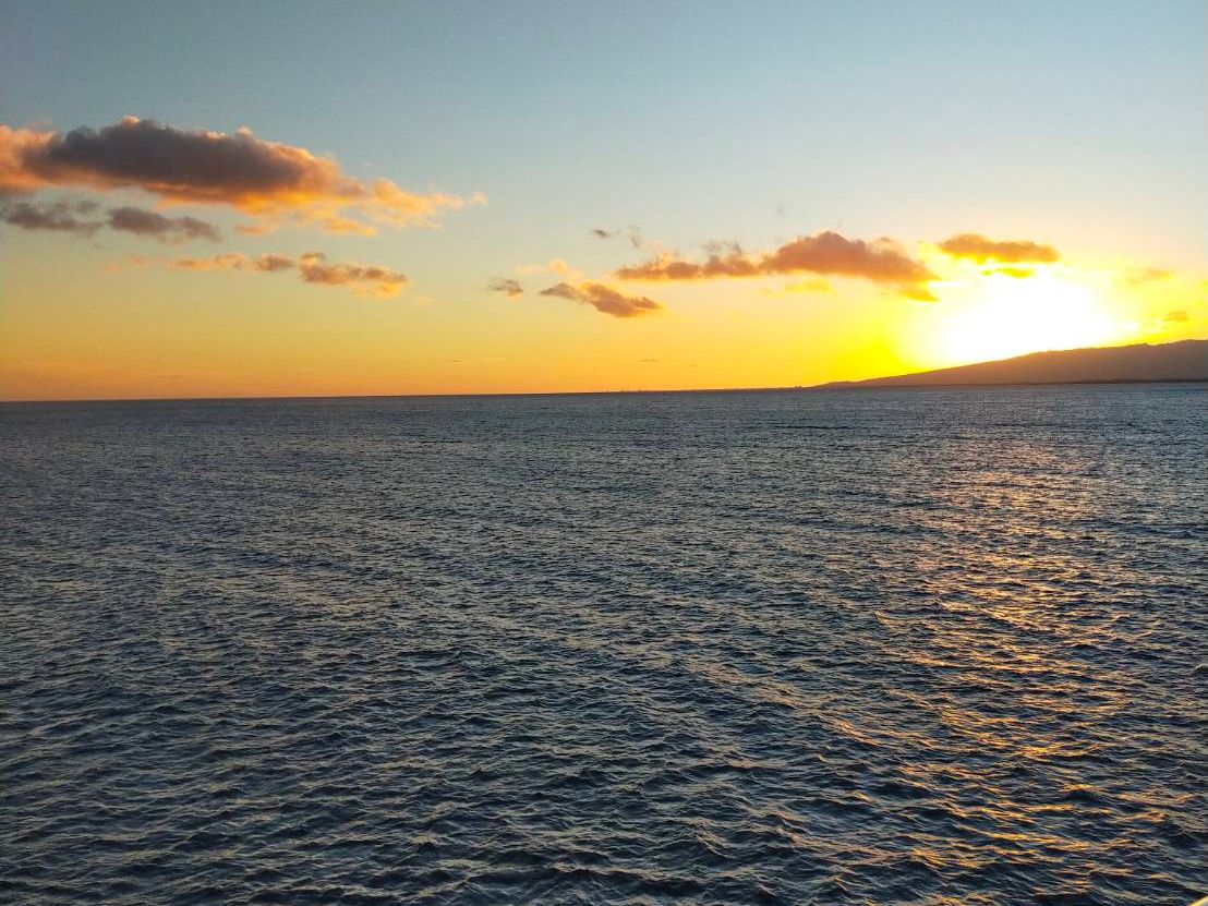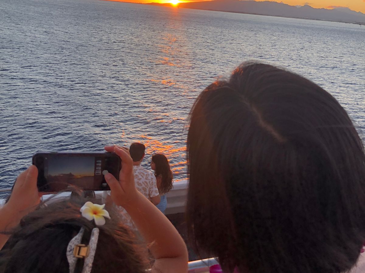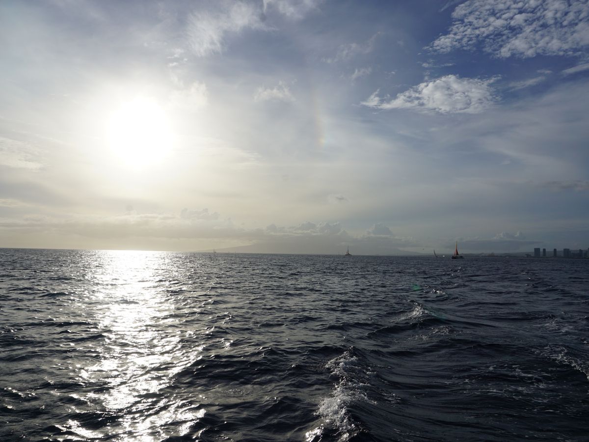 ワイキキ沖ということもあり、海の上から見る夕日はとても綺麗でした。しかし、ツアーの日の夕方は雲が多かったので少し残念でした。船はけっこう揺れるので、船酔いが心配な方は予め酔い止めを飲んでおくと安心だと思います。途中でイルカが船の近くまで来てくれて、船の上から見る事ができました。