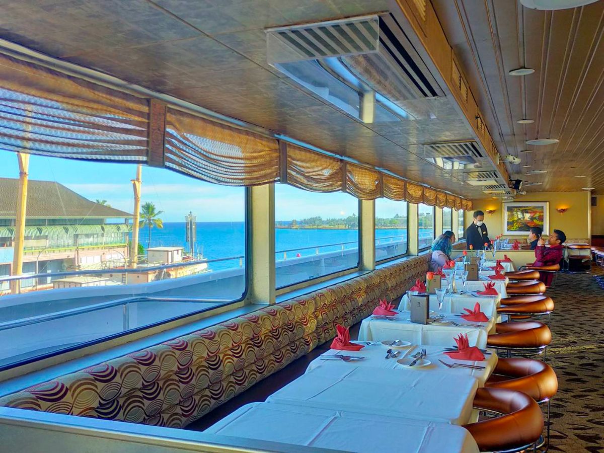 ワイキキからレッドライントロリーで、カメハメハ大王前で下車し、観光しながらアロハタワーを目指しました。付近のモールは、コロナ禍の影響かクローズしているお店が多く、トイレも使えず、困りました。チェックインでは、携帯のバウチャー画面を提示して、お決まりの写真撮影から始まり、乗船しました。食べきれない程のディナーは不要な私たちには、ワンドリンクで十分でした。(船上でドリンクオーダーはできます。従業員の中に日本人の方がいたので、英語できなくても大丈夫だと思います。)他の乗客は、アメリカ本土からの観光客が多かったような印象です。船の中にトイレはありましたが、あまりキレイではありませんでした。アロハタワー近くのピア6からワイキキの沖の方に移動してダイアモンドヘッド沖の手前でUターンして戻りました。夕暮れ時で、ワイキキの明かりや夕焼けがとてもキレイでした。風が強いので、羽織る上着は必要です。下船少し前に、乗船前の写真をデータかプリントされた物を買わないか?従業員が聞きに回ります。私たちは、安いプリントされた写真を購入しました。(現金で、25$くらいだったと思います。)下船後は、The busでワイキキに戻りました。