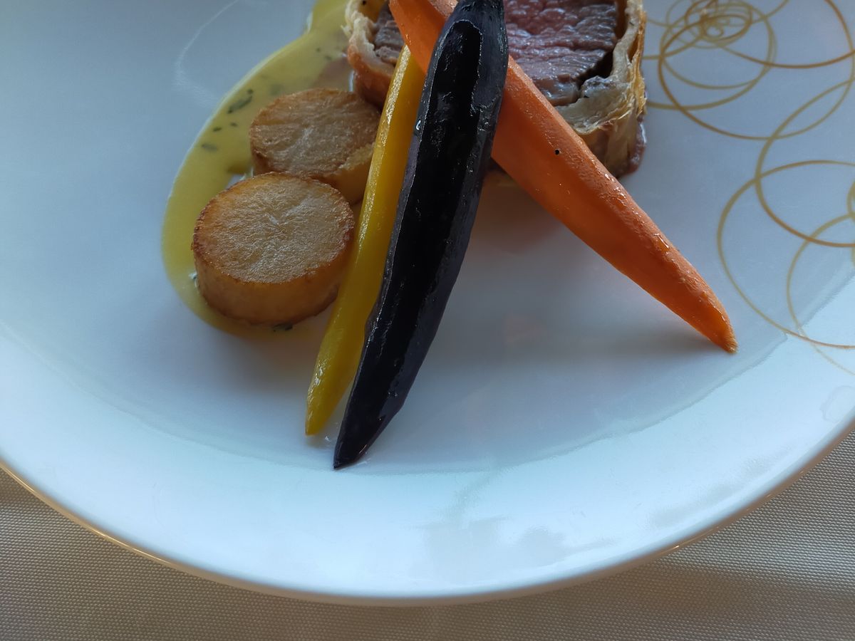 ディナーは良かったです。料理の温度がもう少し熱かったら良かったですが、美しく盛り付けられていました。サーバーは素敵な若い女性で、快適な笑顔を持っていました。