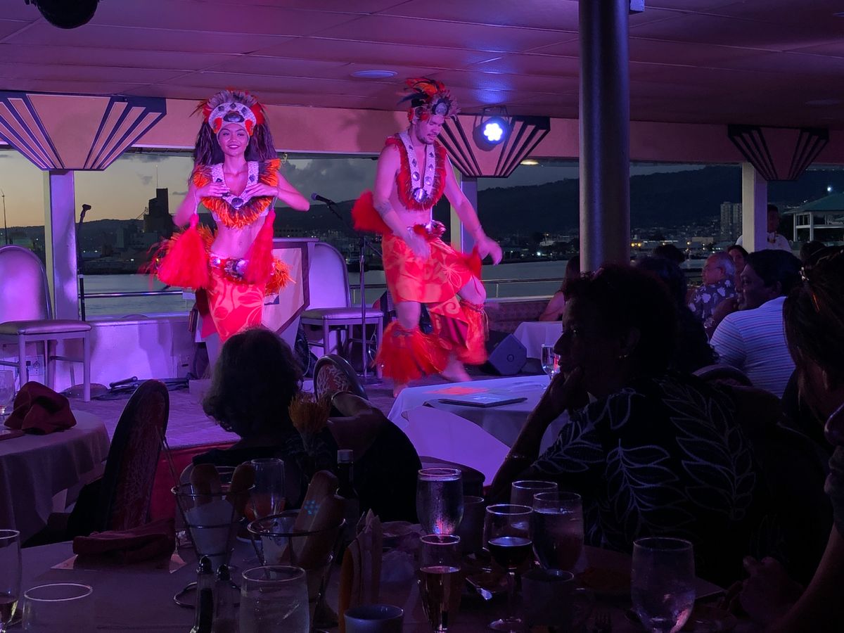 チーズの取り放題から始まり、サラダ、前菜、スープ、ロブスター、ステーキ、ケーキなどフルコースを堪能。シャンパン付きの窓際指定席を予約しましたが、景色も素晴らしく、甲板に出て写真を撮ることも自由だったので、虹や夕日の落ちる瞬間まで外で写真に納める事が出来ました。ショーでは、フラやハワイの伝統的な踊りを堪能して,締めくくりはお客さん皆んなが総立ちでYMCAを歌って踊っていました!お客さんは欧米人がほとんどでしたが、我々もよく知っている西城秀樹がカバーしたYMCAだったので非常に盛り上がれました!出来ればまた参加したいと思います。