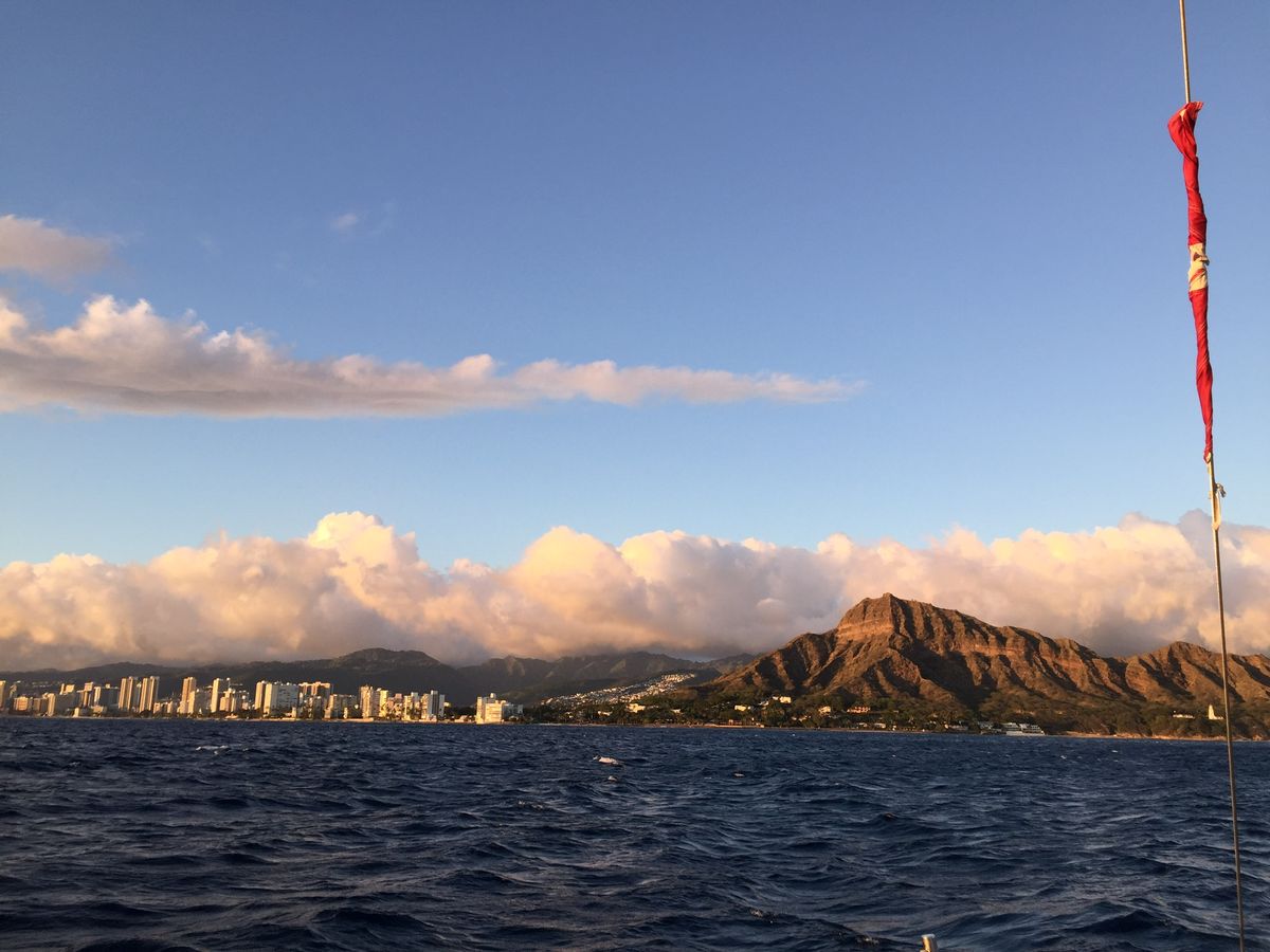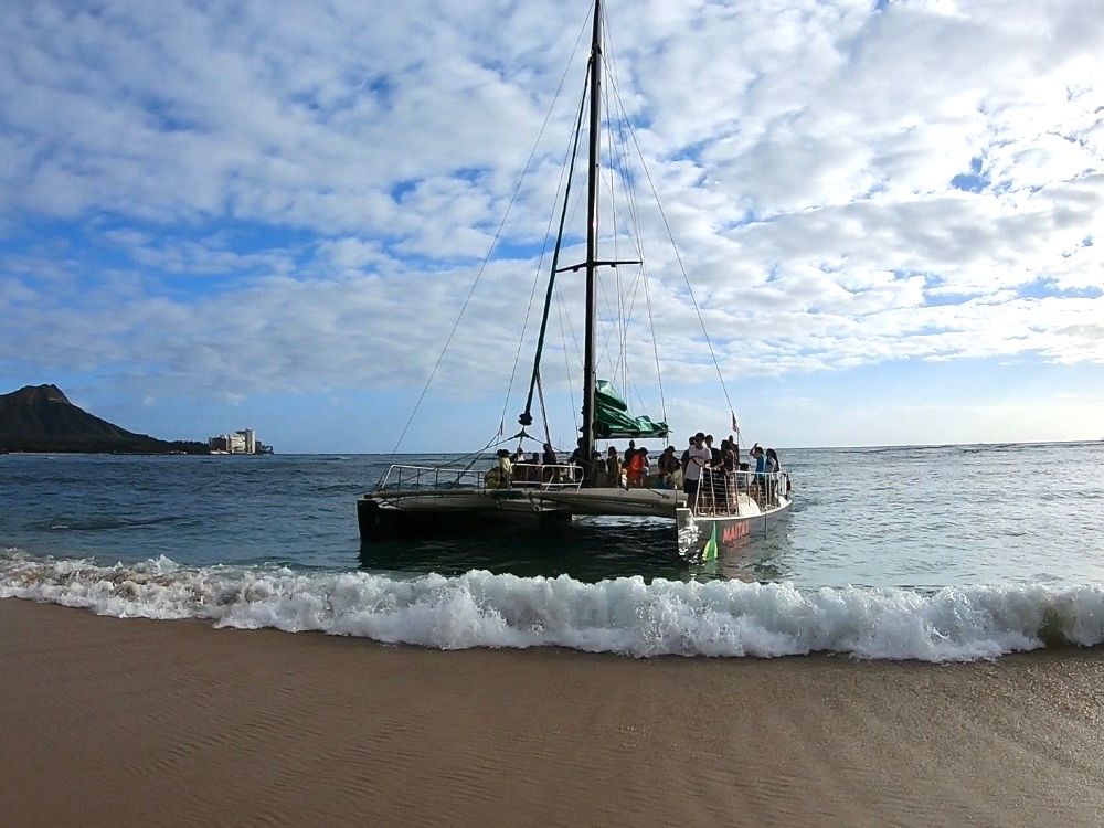 ヒルトンハワイアンビレッジ宿泊だったので直接集合場所へ。集合場所にオフィスがある訳ではありませんのでご注意を。私はGoogleマップでナビして行きました半分日本人、半分外国の方での利用。飲み物、菓子類を出発と同時に案内してくれました。ヨットの乗り心地も良くサンセットまでは普段見ることのない海側からのダイヤモンドヘッド、オアフ島を見れました。海に入る時間も十分ありましたが、シュノーケルを持ってきてなかったこと、魚がいそうではなかったこと、寒そうだったこともあり私は入りませんでしたが、入っている方はプカプカと楽しそうでした。シュノーケルを持って行ってれば海中を見ることは好きなので入っていたかも。帰りは風もあり、かなり涼しく感じられるので羽織るものは特にこの時期は絶対必要だと思います。