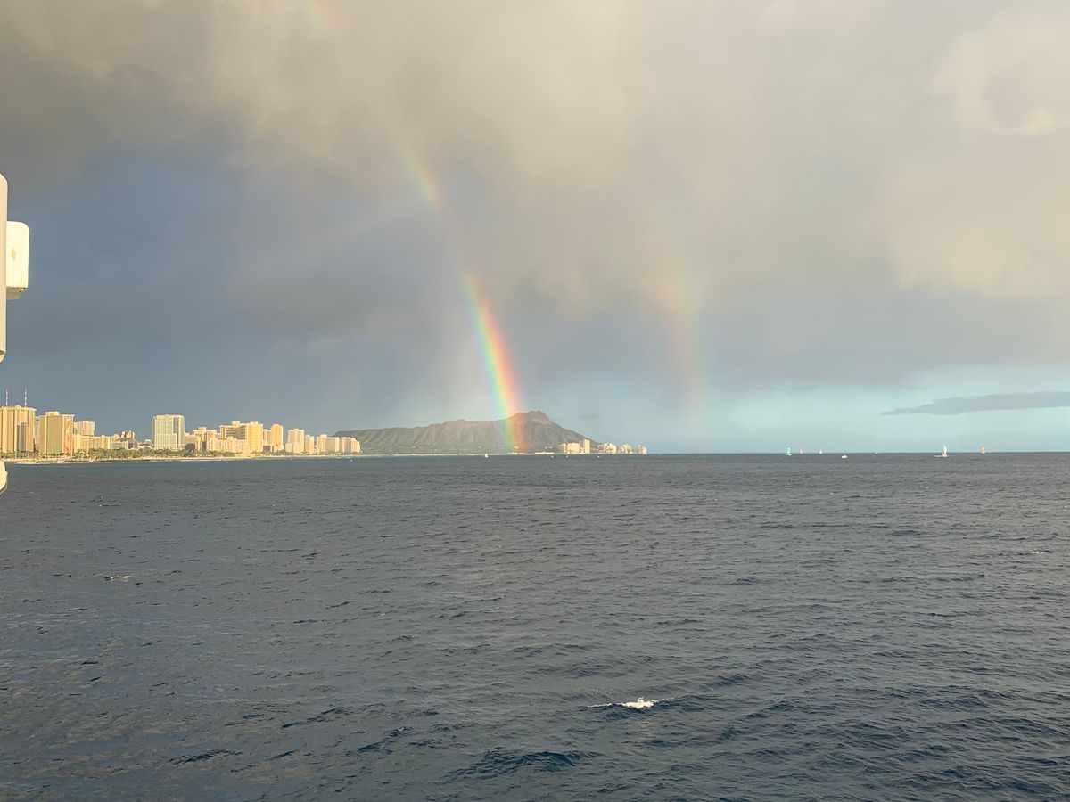 乗った日は時々雨がふったりと雲の多い日でしたが、雨のおかげで虹がかかり、日が落ちるときには雲もきれ、とてもきれいな夕日を見ることができました。食事も美味しく、ショーも素敵で楽しい時間を過ごせて大満足です。