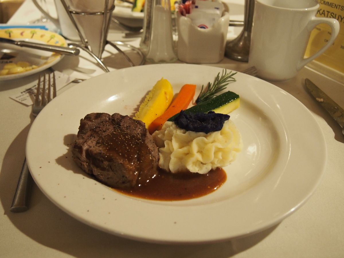 ディナー内容は、サラダ、ロブスター丸々1匹、フィレステーキ(火が通りすぎていたかな~)マンゴームース、珈琲か紅茶、ボトル以外のアルコール、ソフトドリンクが1人2杯まで。という内容でした。