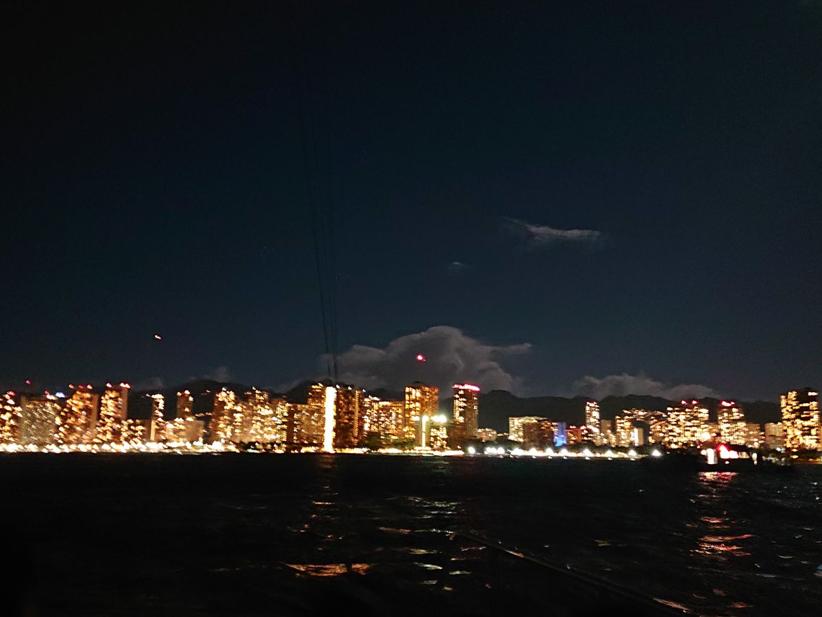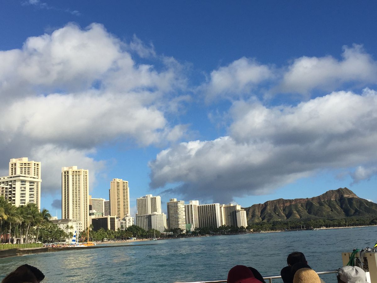 屋上デッキに出て、沖からワイキキ、ダイアモンドヘッドの眺めに感動!夕日を見て感動!! 料理に感動!!! ワイキキの夜景に感動!!!! ハワイアンソング&ダンスに感動!!!!! 船員、スタッフに感動!!!!!!等々、感動しっぱなしの一時でした。