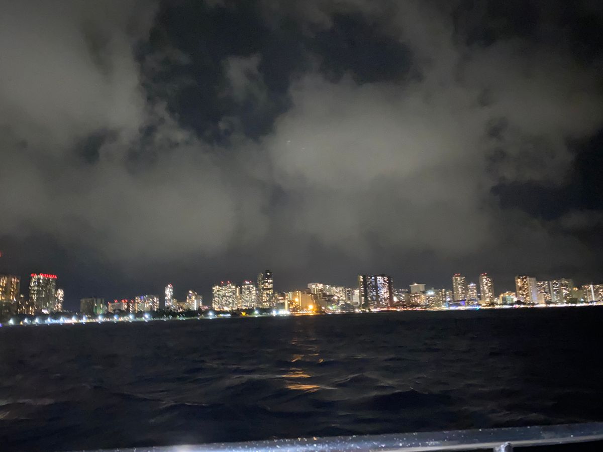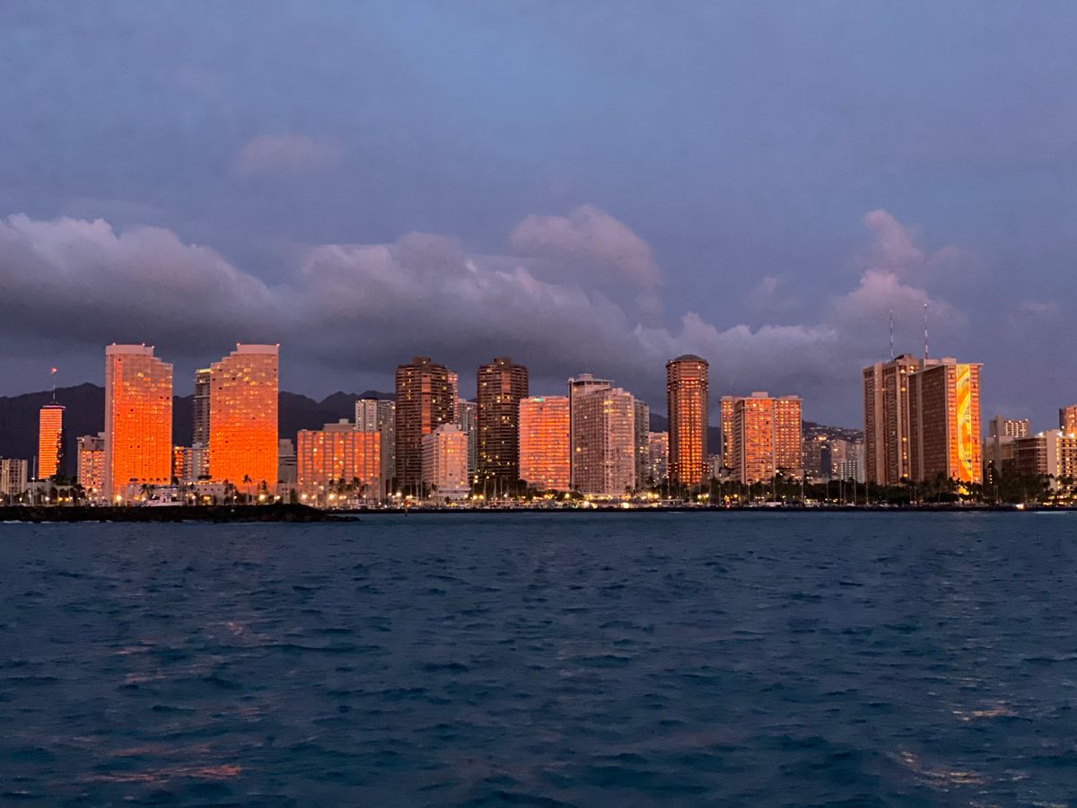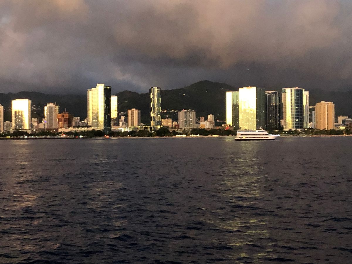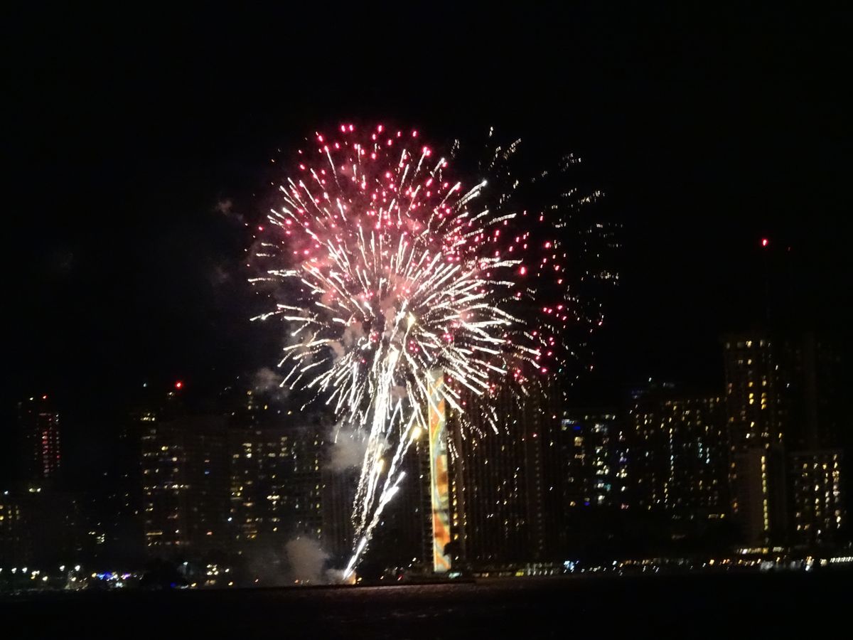 太平洋に沈んむ夕日。夕日に光り輝くワイキキのビル。美しい花火。船内のポリネシアンダンスショー。最高です。食事は今一ですが満足するツアーです。