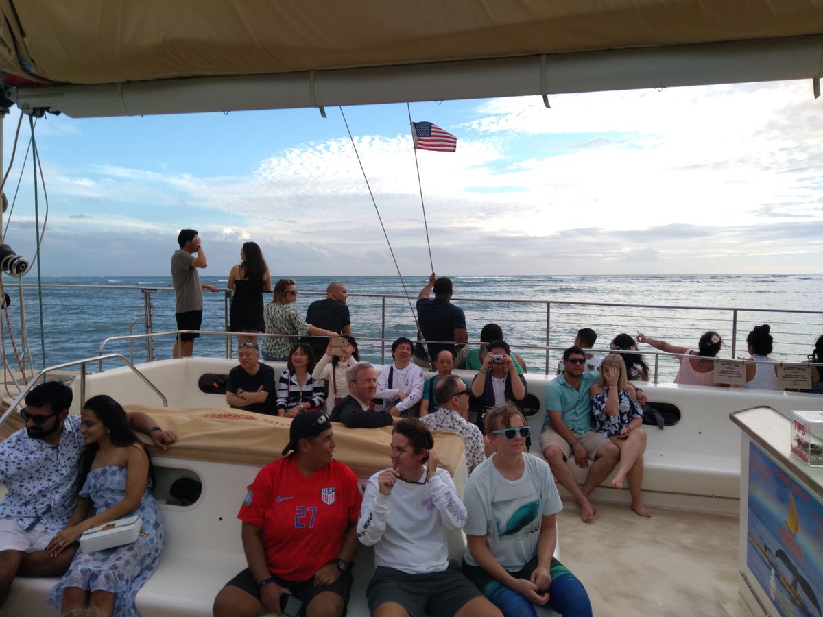 母親と叔母(共に60代)を連れて参加しました。明るいうちから、海上でサンセット、戻る頃には海からワイキキの夜景が見れました。時間は1:30程で船に慣れてない人は長いかなと感じますが、ハワイの海を充分に堪能できると思います。