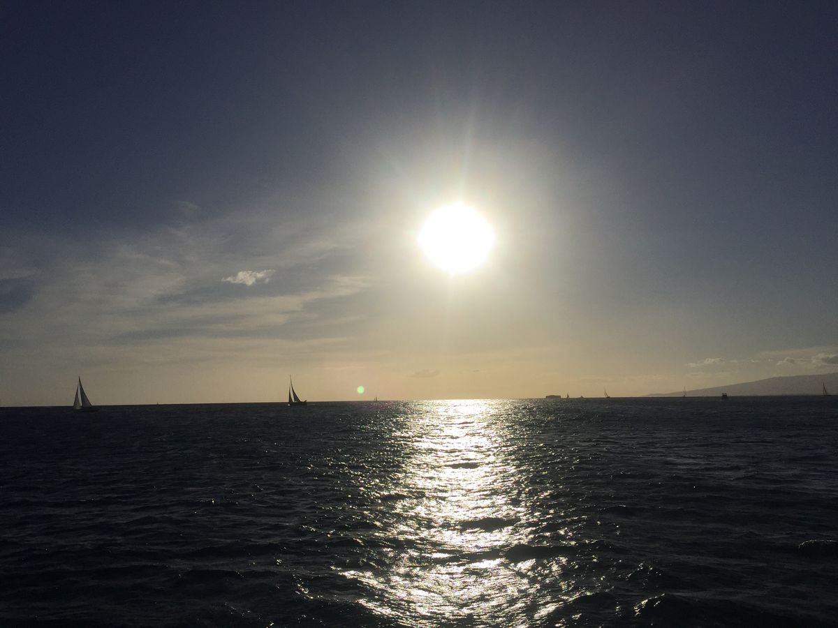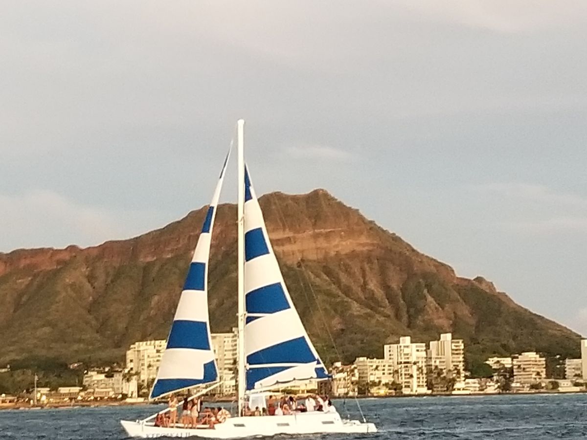 翌日は最高のお天気に恵まれ、イブニングセーリングへ。海上からダイヤモンドヘッド、ワイキキビーチ全景も最高!!マイタイも美味しいけれど、ドン〇