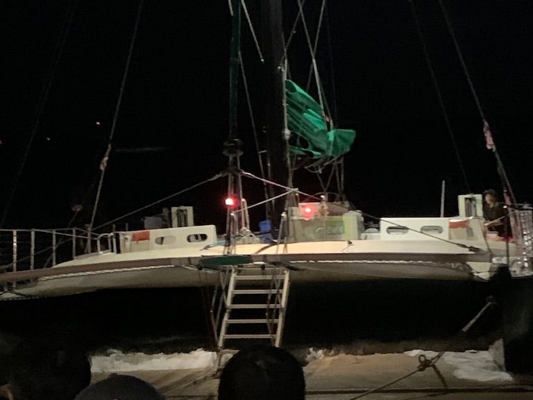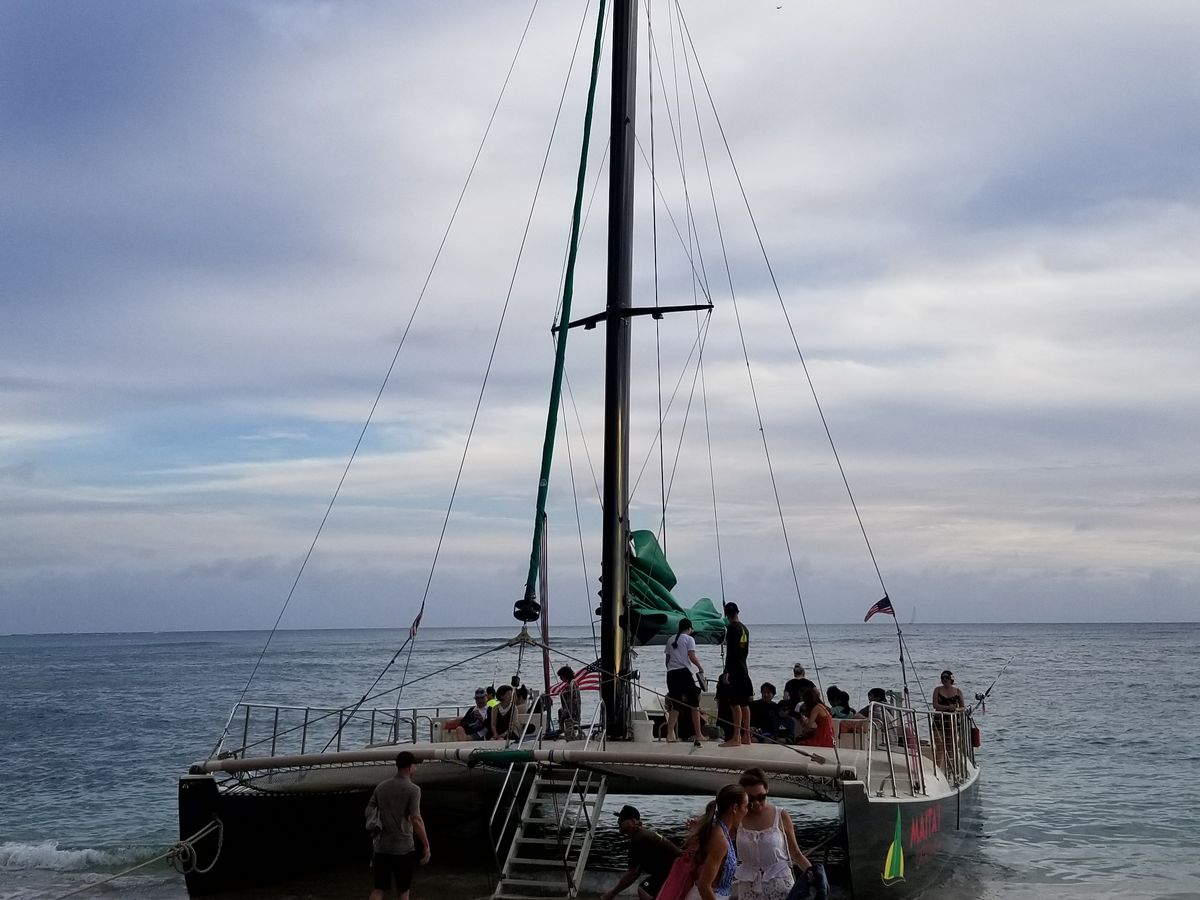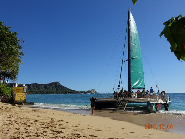 前日、下見に行ったら、昼便のセーリングから帰ってきたカタマラン号。なんとホヌ(ウミガメ)2頭が海岸近くまで追っかけてきました。乗客も大喜び!