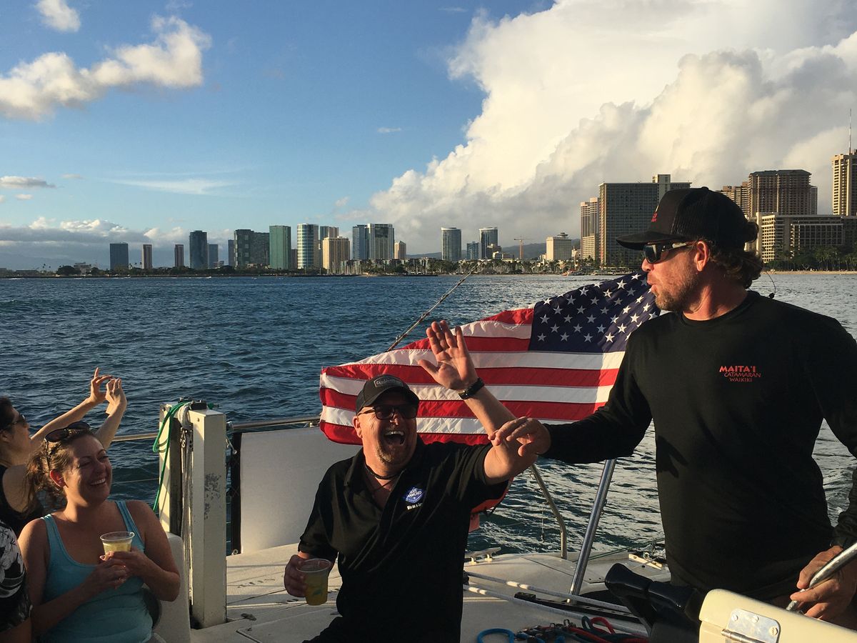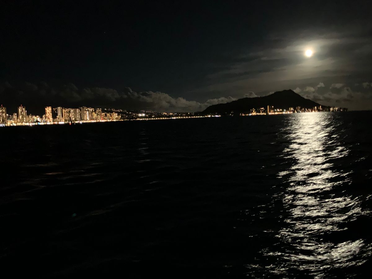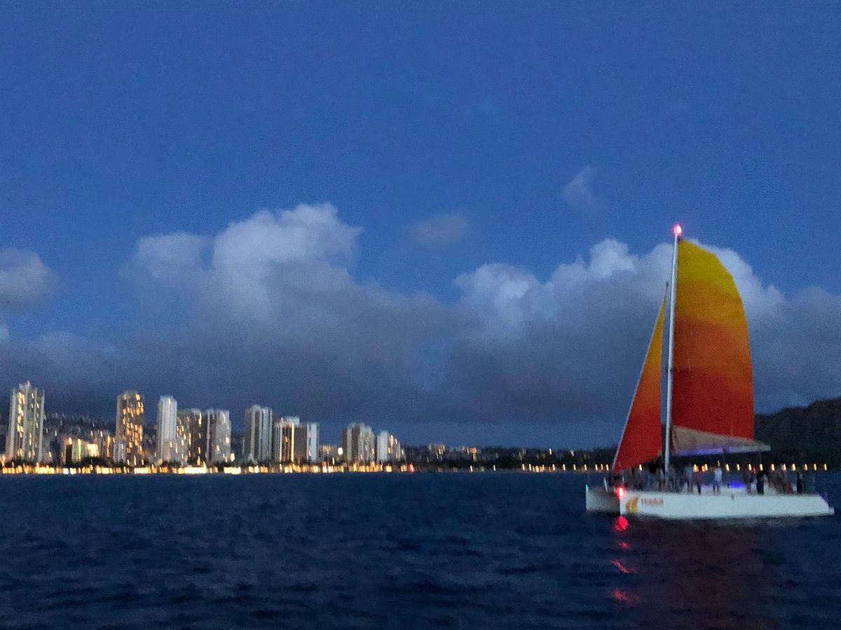 ハワイの最終日に参加しました。朝は肌寒く少し心配していましたが、参加する頃には丁度良い気温でサンセットも綺麗でした。一緒に参加した方にノリの良い外国人の女性がいらして、とても楽しかったです。船長さんも優しく楽しい方でした。船上から見るダイヤモンドヘッド・ホテルの灯りはとても綺麗でした。
