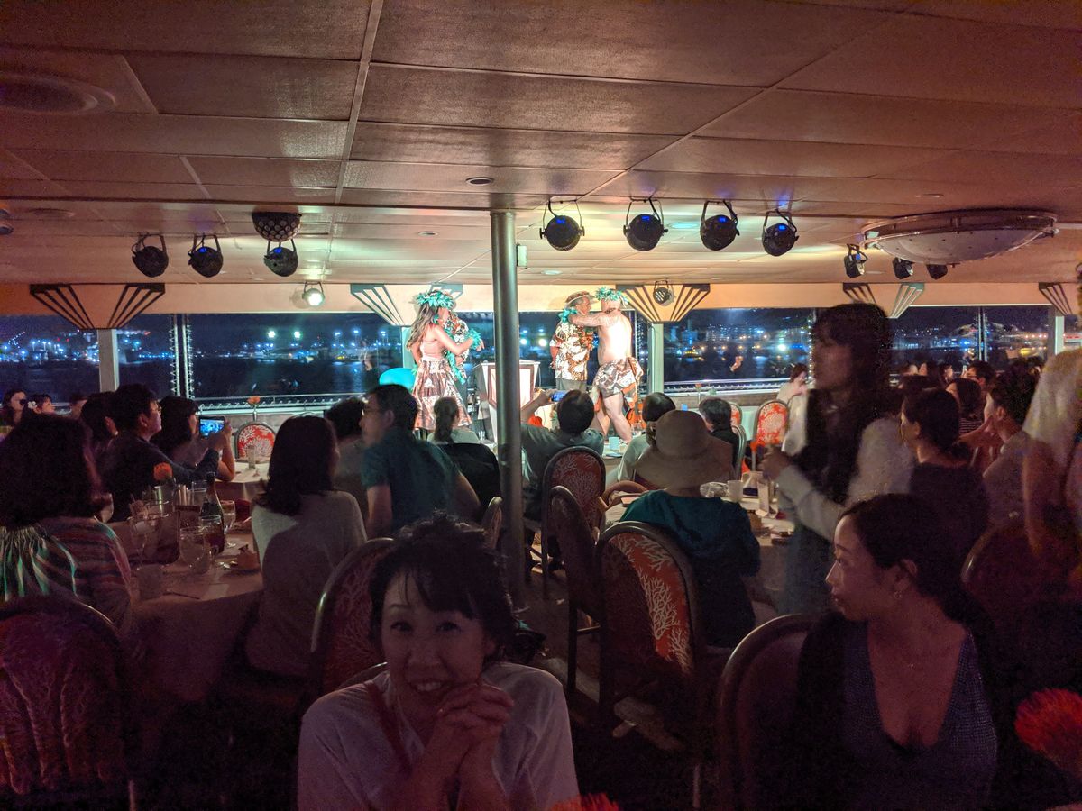 10年前に乗ったときは初めてだったのとその日の天気が良くて夕陽が照らすダイアモンドヘッドがピンクに輝いてほんとうに美しかったです。ライブを聴きながら大人の時間が過ごせました。それと比べると今回は夕焼けは少し雲が多く、空いている席も半分くらいあったので盛り上がりにかけていました。3つ星の方がお客さんも多く、他のグループとダンスをしたりおしゃべりを楽しんだりと賑やかで楽しそうでした。次回は3つ星にしてみようかと思います。