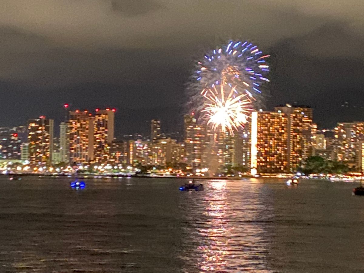 最後の夜はハワイといえばのサンセットクルーズです。ちょうど最後の夜はワイキキで花火が上がるみたいでワクワクしてました。