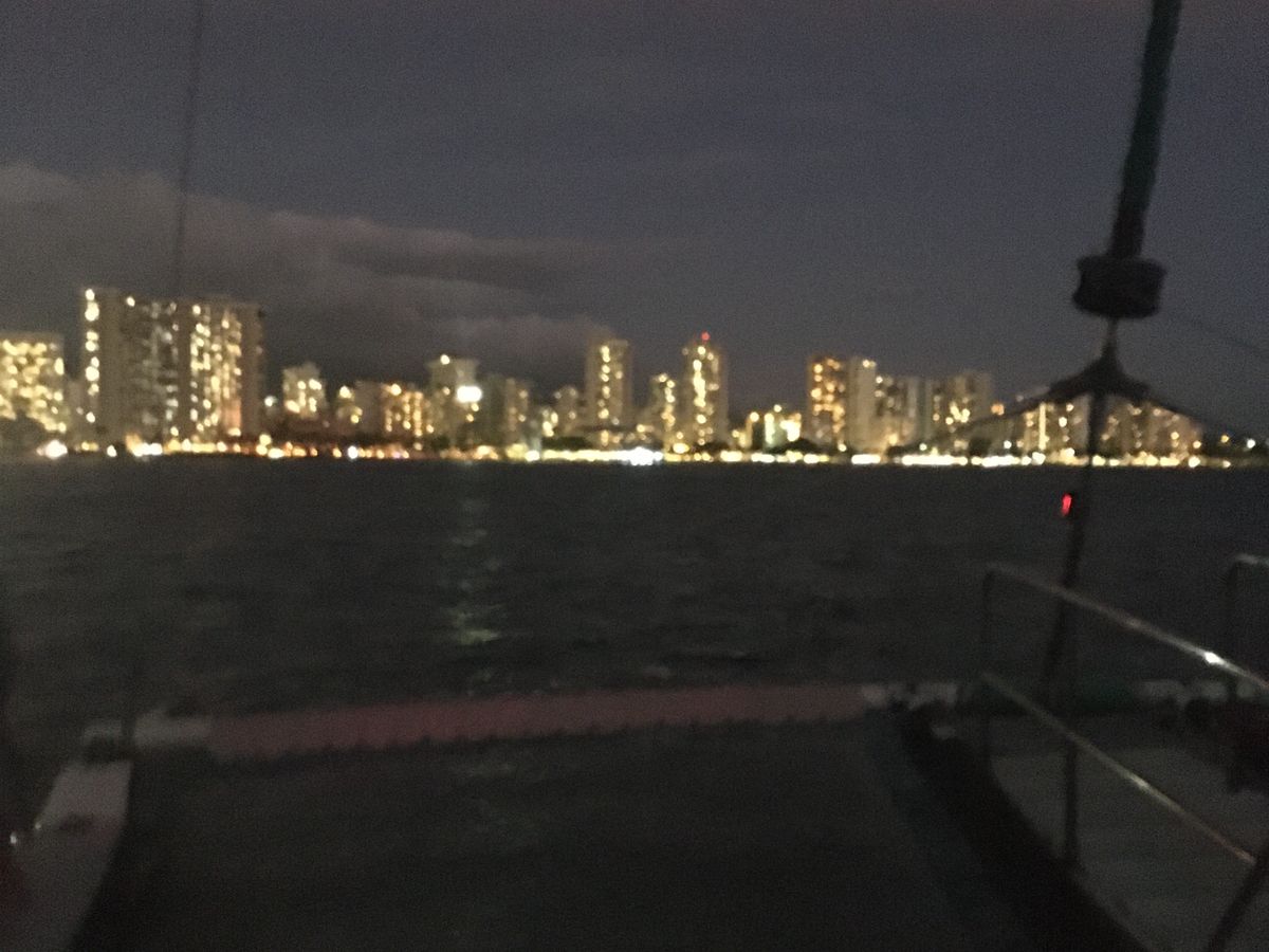 天候はやや曇りがちでしたが、船上は日本人は我々二人だけでしたが陽気でハンサムな船長とノリノリのバーテンダーにより最高のセーリングが楽しめました。綺麗なマイアミの夜景を見ながらPOPな音楽を聴きながらダイヤモンドヘッド沖でタックしてアラナモア方面を回るころには全員が仲良くなって大盛り上がりで最高のセーリングになりました。HAWAIIに来たなら一度は経験すべきイベントだと思います。
