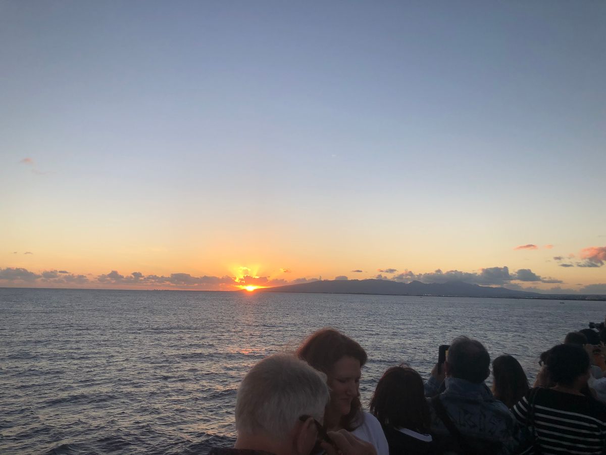 夕焼けを見ながらディナー。途中でショーもありで子ども達も楽しく過ごせました。ダイヤモンドヘッドに沈む夕陽のタイミングで甲板に出たり通路に出たりして写真撮影。これまた参加して良かったツアーでした!