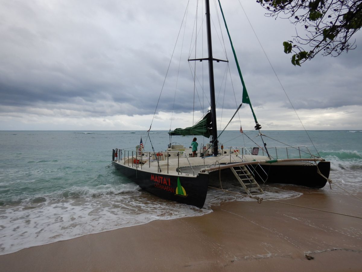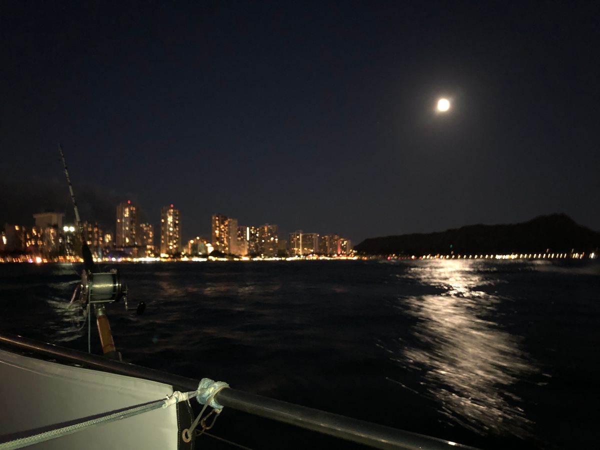 サンセットセーリングなのに、何かの都合(満潮?)で出航が少し遅れて、結局ビーチから眺める羽目になってしまいその点は残念でしたが、金曜のセーリングだったので、ヒルトン沖の花火も目の前で夜景とマッチして最高でした!また、アルコールを飲みながら聞くキャプテンの盛り上げ演出がグッドでした!