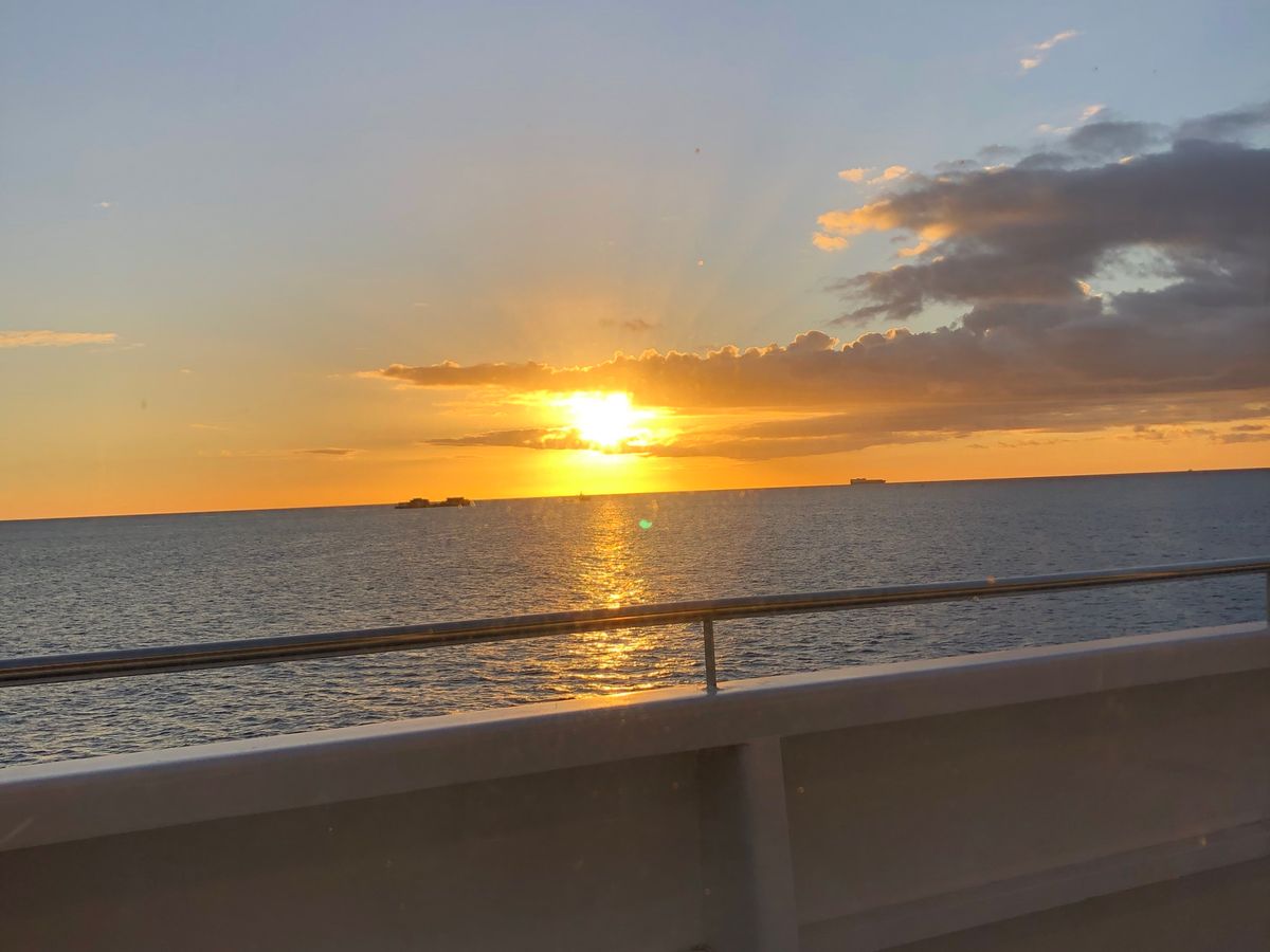 船から見る水平線、夕焼け、夜景が良く時間がゆっくり流れていました。