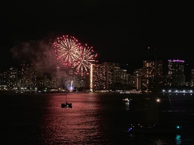 2階3階へは移動が自由でしたので、明るいうちにダイヤモンドヘッドを写真に収めるため先頭へ。夕日を観るため船尾へ。そして花火の時間。打ち上げは5分ほどでしたが満足の花火観賞でした。お天気が良く波もなかったので快適な船からの花火観賞でした。お天気と波は運次第ですね。祈るしかありません。