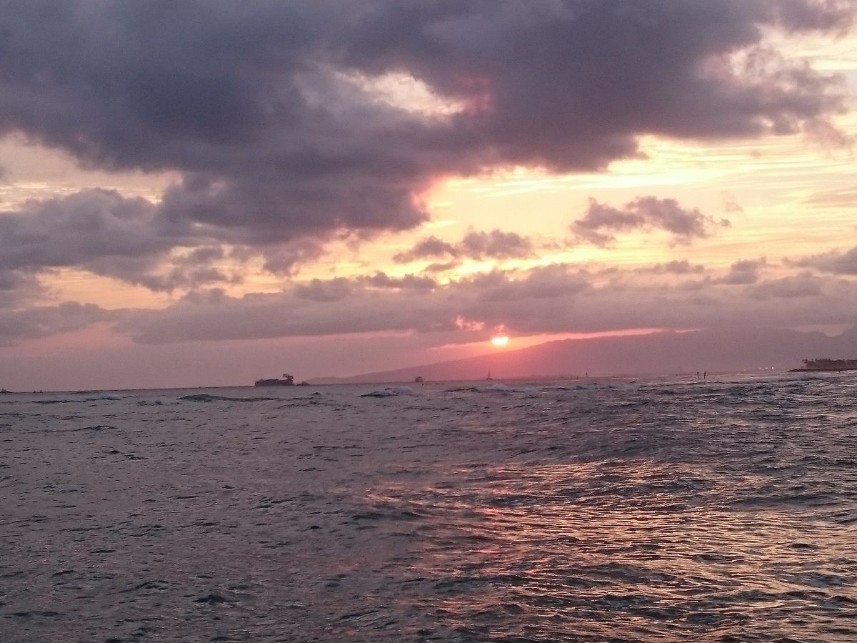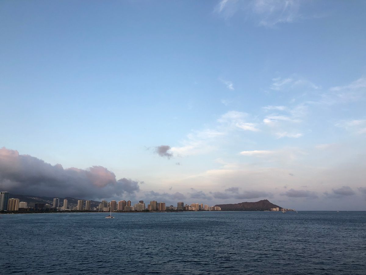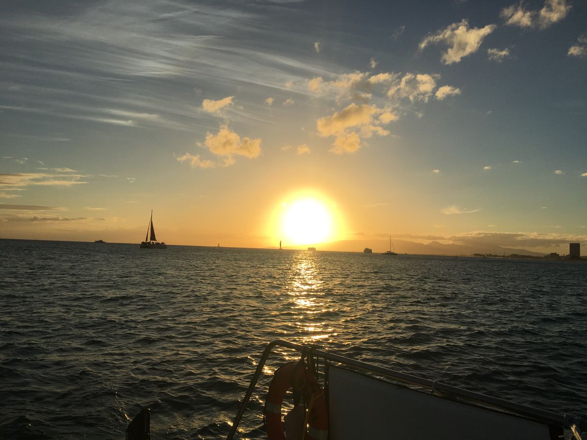 私たちはサンセットクルーズに参加し、食事を楽しみながら、ダイヤモンドヘッドを眺めつつ海での夕日を見ました。
