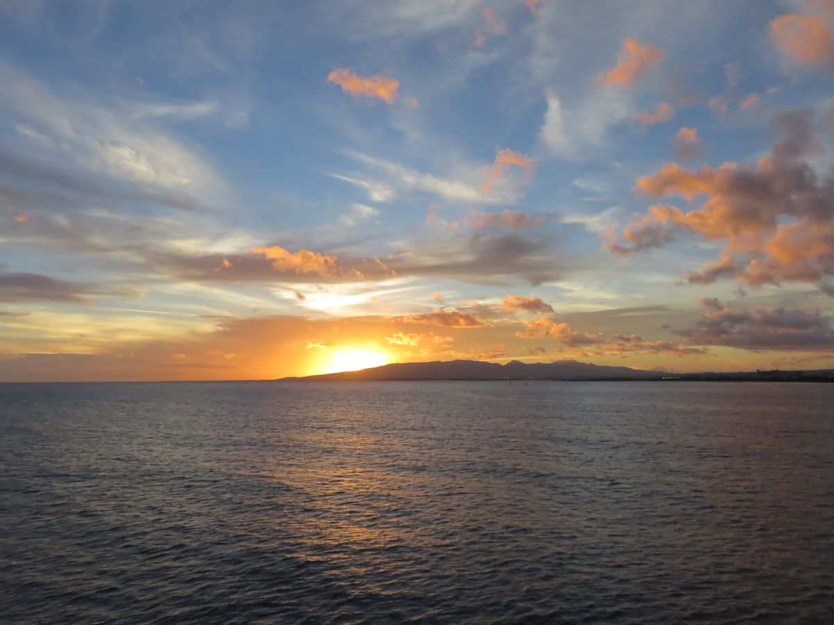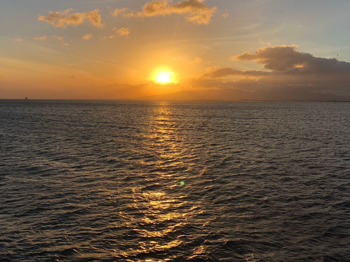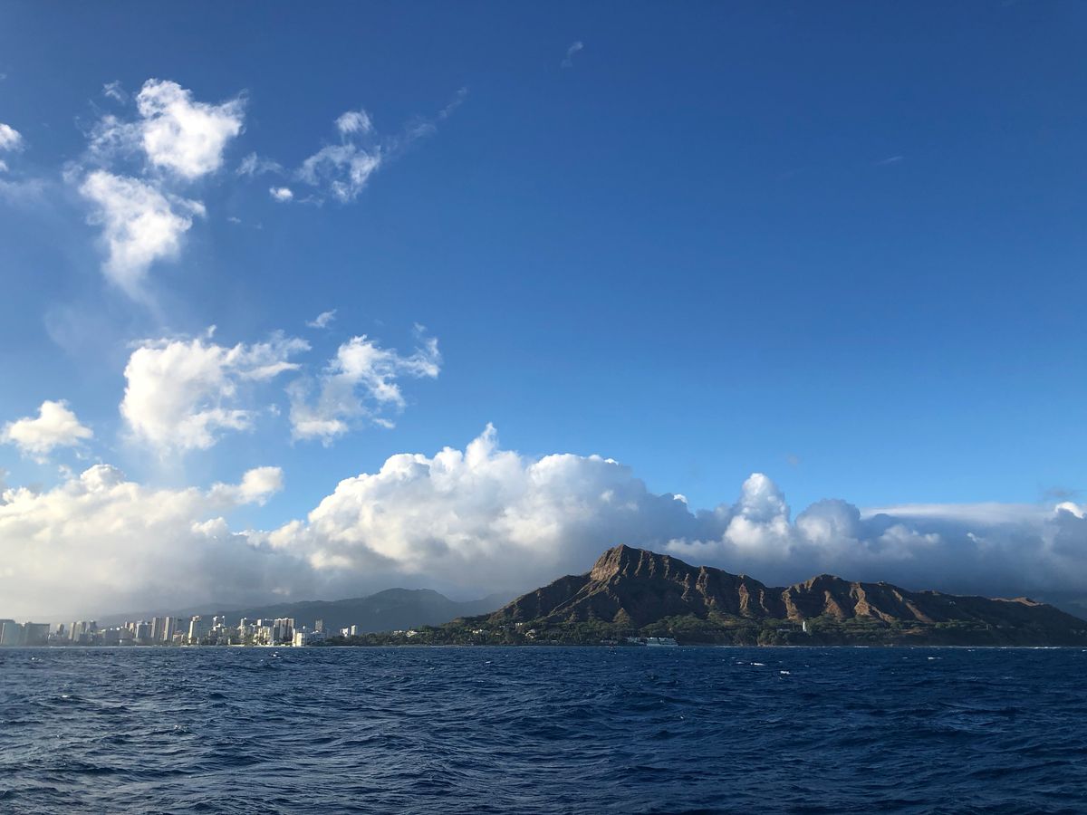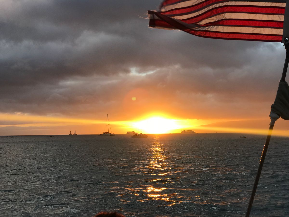 私たちはサンセットクルーズに参加し、食事を楽しみながら、ダイヤモンドヘッドを眺めつつ海での夕日を見ました。