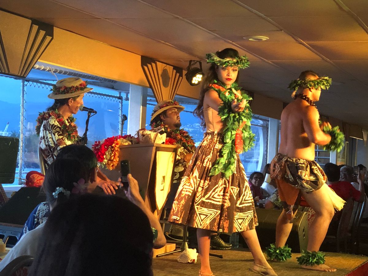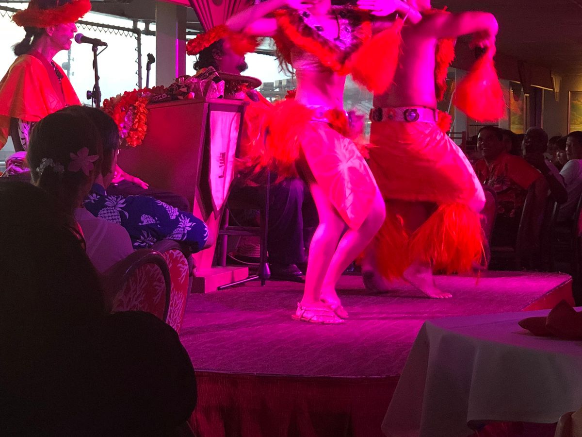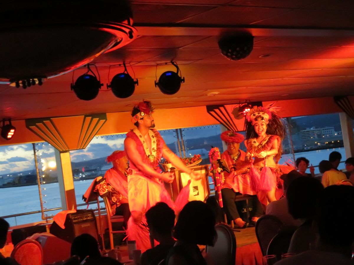 ディナークルーズは、ダンサーさん達が一生懸命盛り上げてくれて楽しい時間を過ごせました。子供達も一緒にフラダンスしたり楽しんでいました。