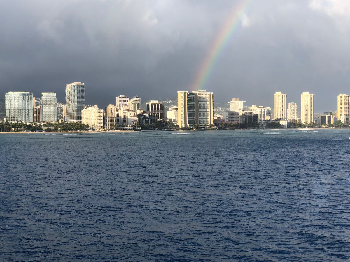 The crew is fantastic. The music, the food and drinks are superb. The view of Honolulu is breath taking. As the catamaran takes me around the harbor I connect with the natural beauty of the mountains and the horizon. The sun slowly slips away and I am wrapped in Hawaiian gold.