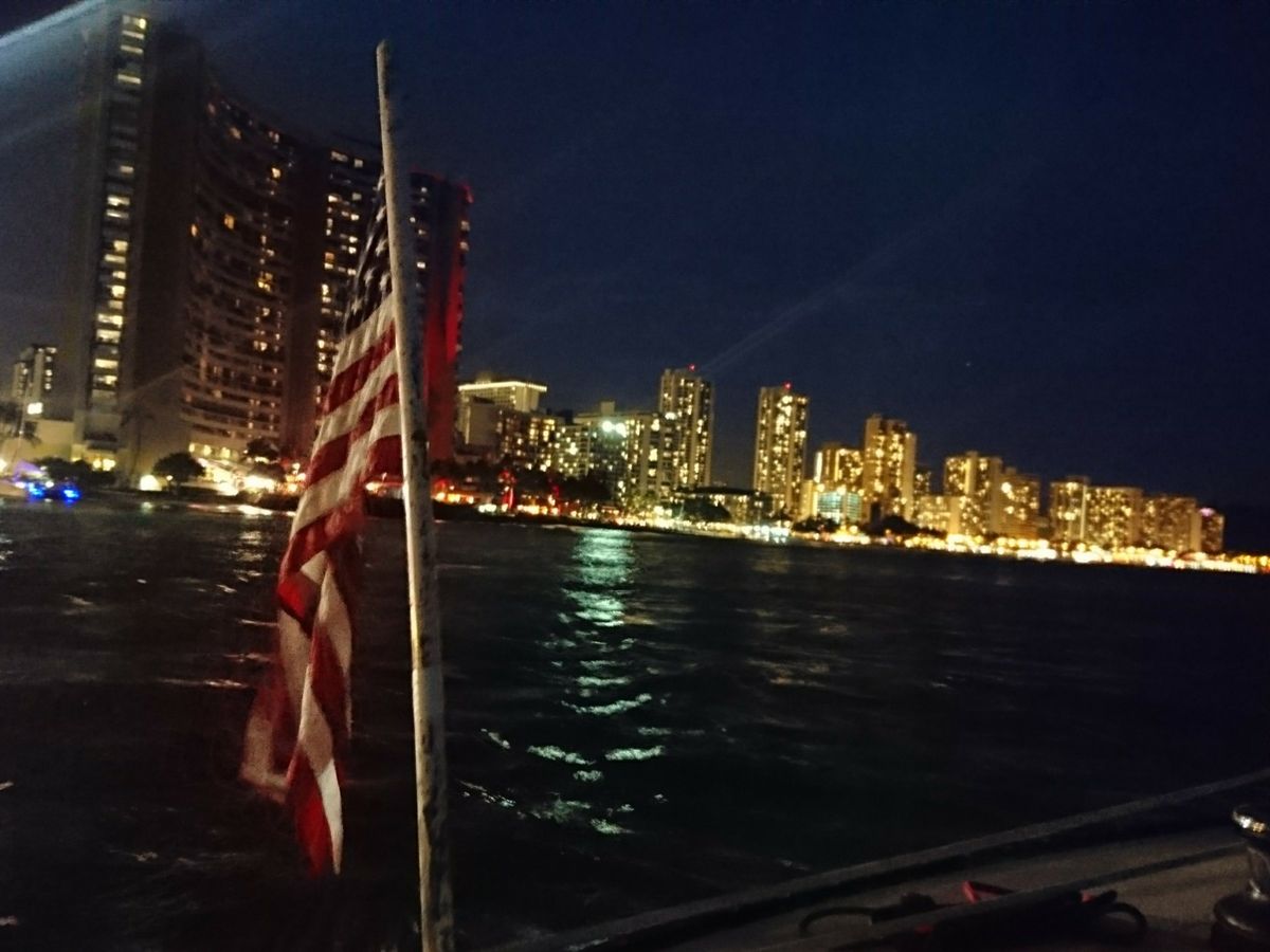初めて参加しました。ヒルトンの花火がある金曜の夜に。花火は遠くからかなー、と思っていたのですが、かなり近くでとってもきれい!その後夜空の美しい星空も楽しめました。特にイベントらしいものはありませんでしたが、マイタイやワインを飲みながらゆったり流れる約一時間半の時間は最高でした。今度は昼のセーリングにぜひ行きたいです!