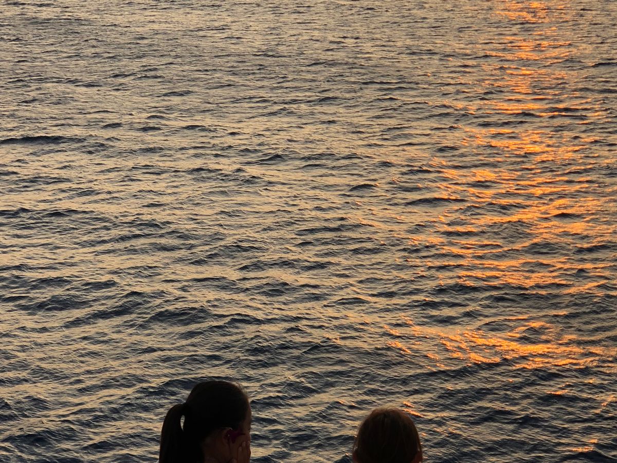 集合場所が思っていたより遠く少し遅れてしまいましたが、船はまだ到着していなくて、そこから30分ほどきれいな夕陽を見ながら船を待ち、日が暮れた頃に乗り込みました。