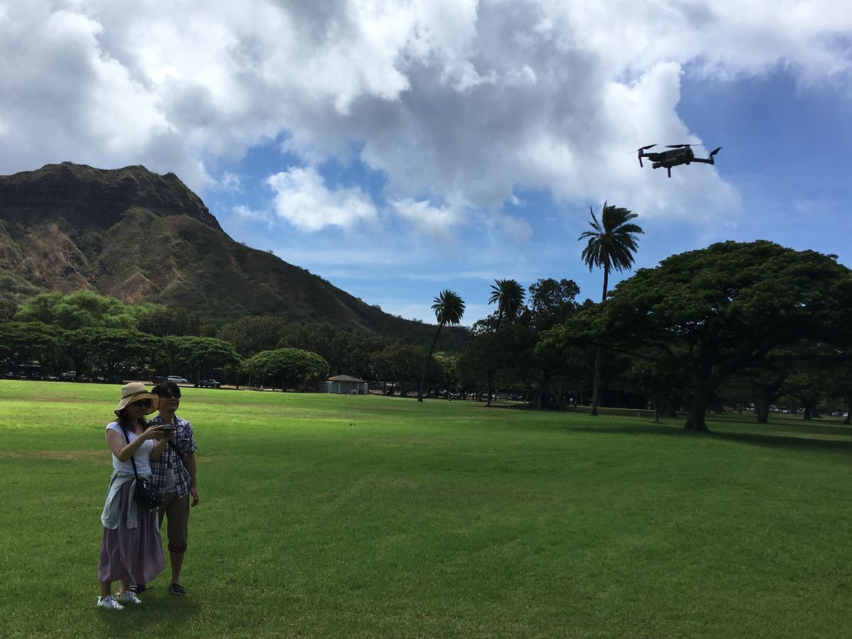はじめてのドローン体験。ハワイのカピオラニ公園で海とダイヤモンドヘッドが見える最高のロケーションで、ドローンの基本操作を学びました。風がかなりありましたが、高価なドローンがとても優秀で、風に流されず、しっかり操縦に応えてくれました。はじめての操縦は、ドローンを見失うこともありましたが、少し慣れてくれば、基本的なことはできるようになります。動画も写真も、まるで映画のように綺麗に撮れて、とても感激しました。もう少し練習を重ねられたら、自分なりに工夫して、本物の映画で使えるような映像を取れるかもしれない??と思いました。