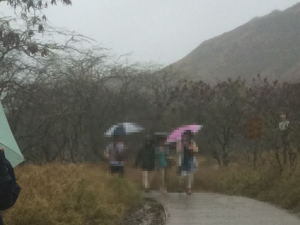 ダイヤモンドヘッドからの日の出を楽しみにしていたのですが、生憎、土砂降りに合ってしまい、全く見られませんでした。珍しいことのようです。意地で傘さしで山頂まで行って帰ってきましたが、上から下までびしょびしょです。南国でなかったら無理ですね。