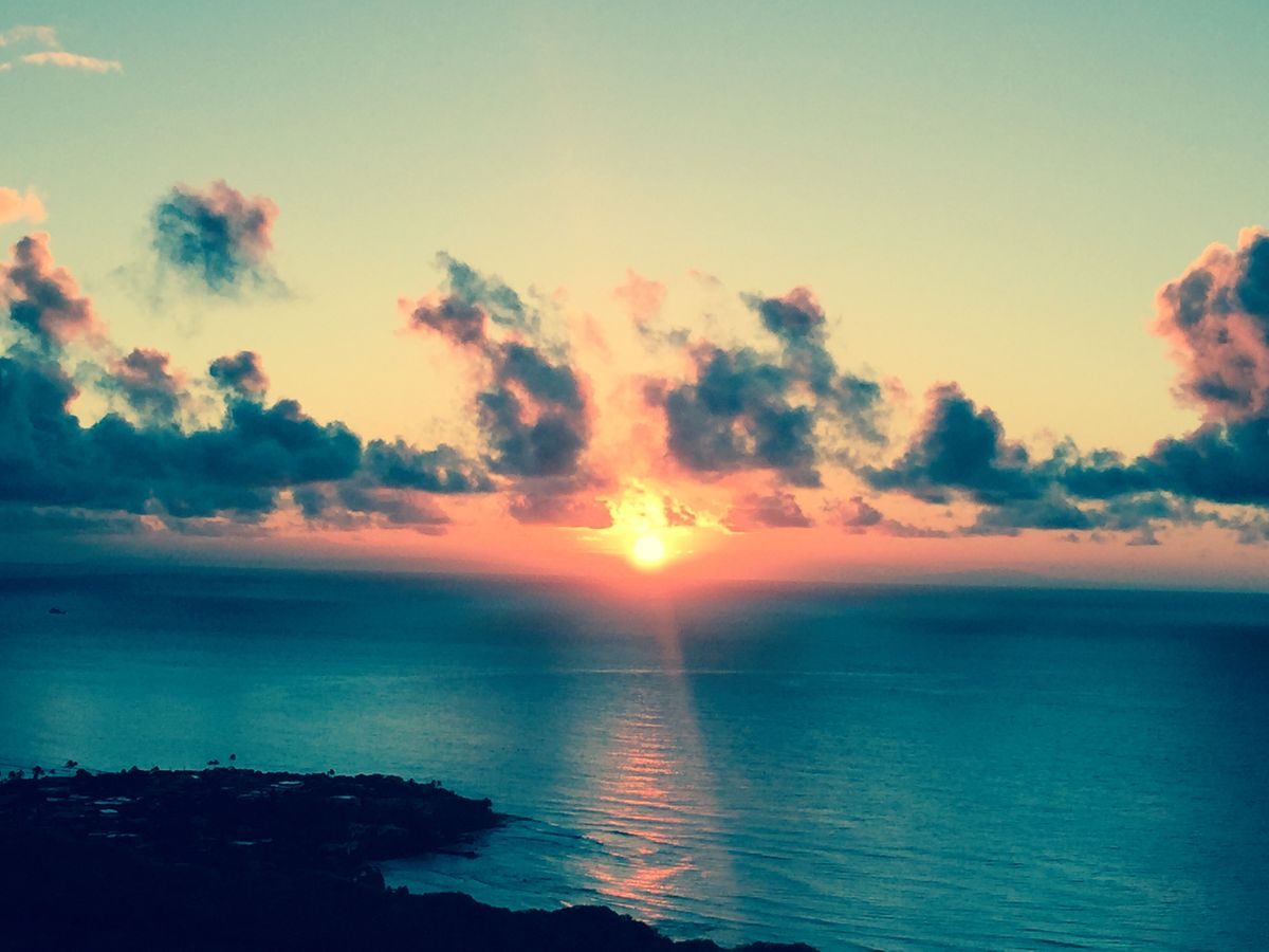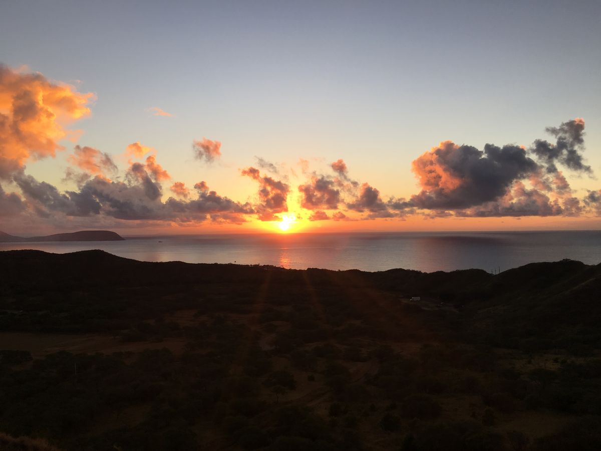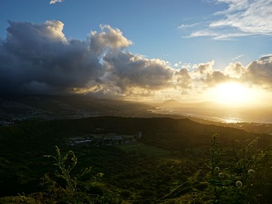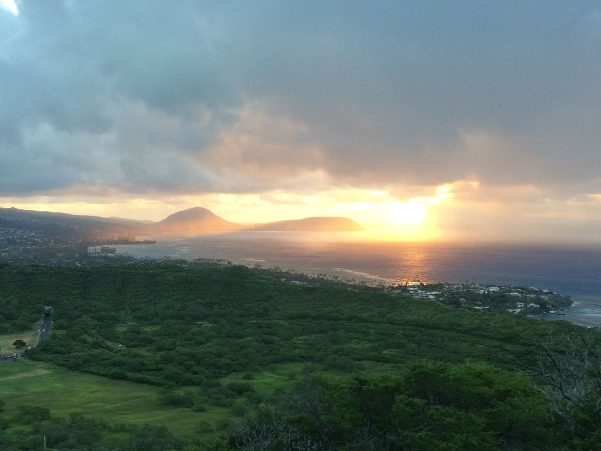出発した時は、スコールで心配でしたが、ふもとに到着した頃には、後光が差してて、ステキな日の出と、Honoluluの景色を一望出来ました!ちょっと感動ものでした!