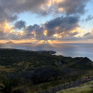 初めて3月にハワイに行ったので、この時期でないと見れない、ダイアモンドヘッドからの朝日が見れるこのツアーを申し込みました。6時過ぎにダイアモンドヘッド入り口に到着。薄暗いくらいだったので、懐中電灯不要で上り始めました。生憎雲があって日の出は時間がかかりましたが、なんとか見ることができました。小雨も降ってたので、そのあと、ダブルレインボーが見れたのがラッキーでした。