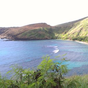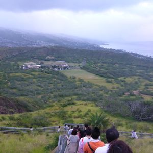 友人の息子さんが20年以上前に行ったことのある「魚がいっぱいいる海」に行きたいとのことだったので個人的に路線バスやタクシー利用よりも色々システムも変わっているようなのでオプションのほうが楽かと思い、またせっかくだからダイヤモンドヘッドも登ってみようということになりこのコースを選びました。朝4:30起きで約40分かけて頂上へ。最初はなだらかな坂道ですが最後の難関が長ーい階段。でもてっぺんでの景色はやっぱり最高でした。最初は登山を嫌がっていた人も朝日や景色には感動していたようです。ちなみに私は毎回サンダルで登りますが行きは問題なし、でも帰りは下り坂なのでちょっ怖いかな。その後ハナウマ湾へ。