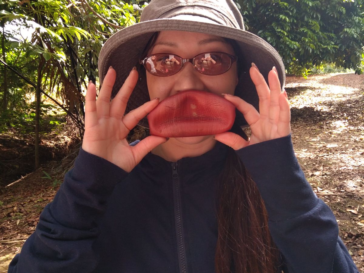 その後、2グループ合同でフルーツてんこ盛りのランチタイム。ここでもおいしいアボカドをはじめ、初めて食べるめずらしい果物を何種類もお腹いっぱいになるまで食べました。なかでも噂のハニークリームパイナップルは絶品、驚愕のおいしさ。なんなんですか、これは~?!いっしょに参加した友達も感激していました。