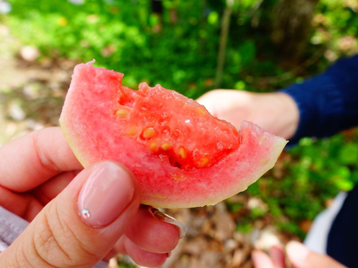 農園に着いてからは、ガイドのゆみこさんが園内を案内してくれました。はじめに虫除けスプレーを貸してくださり、ありがたかったです!園内の木になっている果物をその場でとって、切り分けて少しずつ渡してくれます。酸っぱいものや甘いものなど、食べたことのないフルーツばかりで、良い経験になりました!果物についての説明も分かりやすく、いただく量もちょうどよかったです。