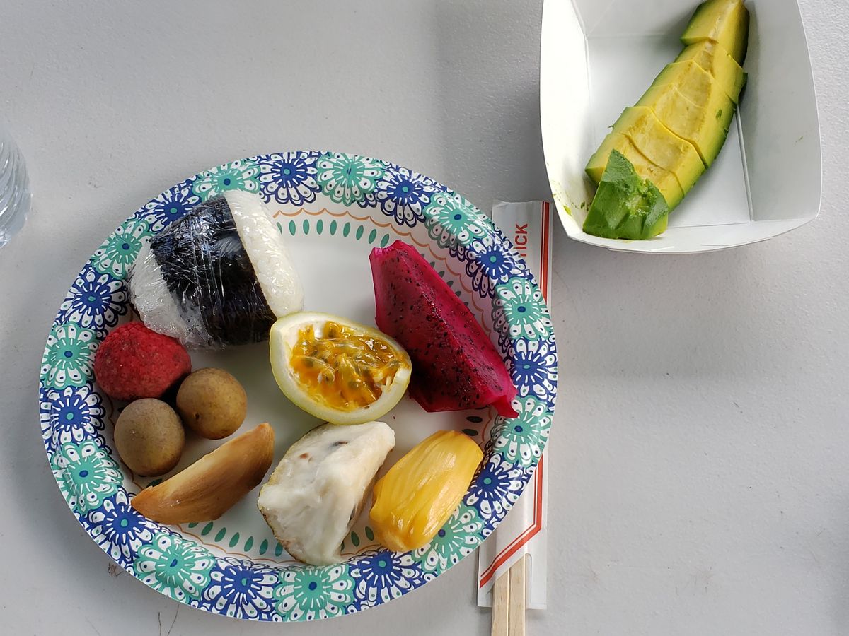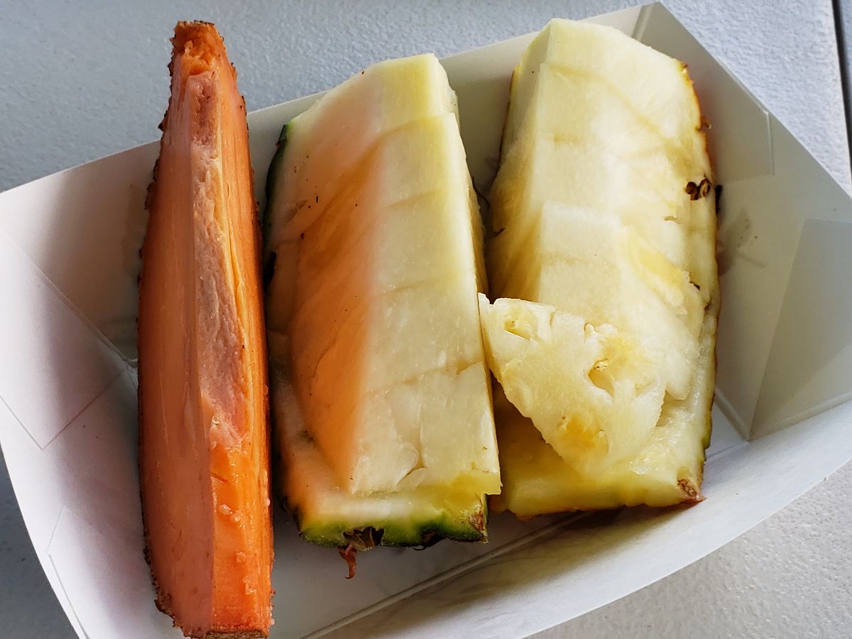 もっと食べたいフルーツはありませんか?とパイナップルやマンゴーなどが後からどんどん出てくるんです。もはや試食ではなく、立派な昼食でした。