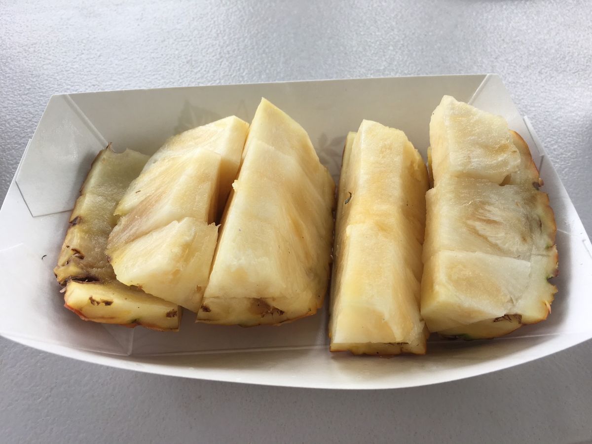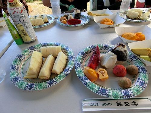 果樹園の散策が終わると試食用に様々なフルーツが用意されていました。お腹いっぱいに試食ができ満足しています。パイナップルの甘さは感動的です。