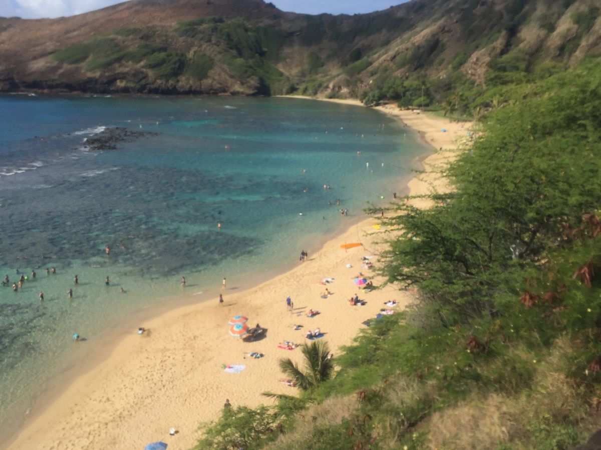 まず最初にハナウマ湾に行きました。ハナウマ湾のキレイさは思っていた以上で、海の透明度にビックリしました。全米のベストビーチに二度もなった様で、ハワイに来たなら、ここは外せないスポットだと思います。シュノーケルはガイドのカオルさんの丁寧な指導のお陰で、何の不安もなく楽しめました。また、シュノーケル中はかわいい子ガメを、ビーチではアザラシが見る事が出来ました。