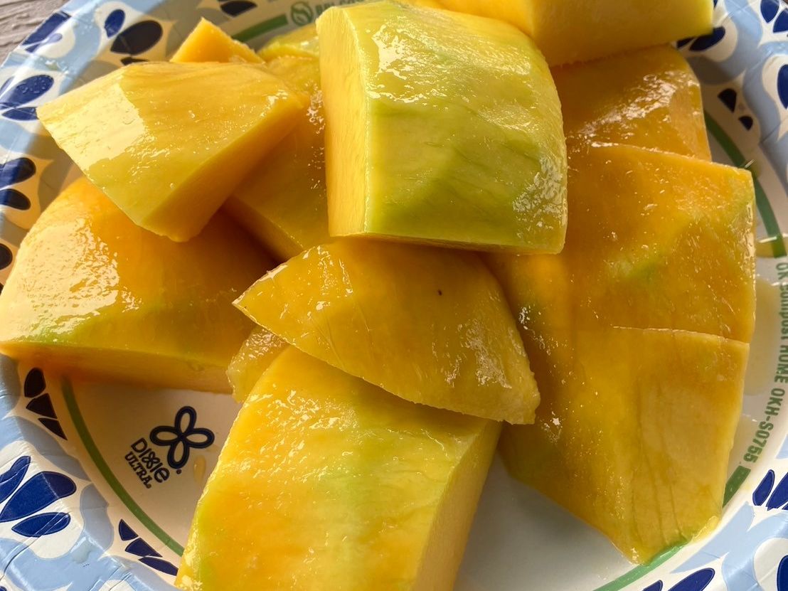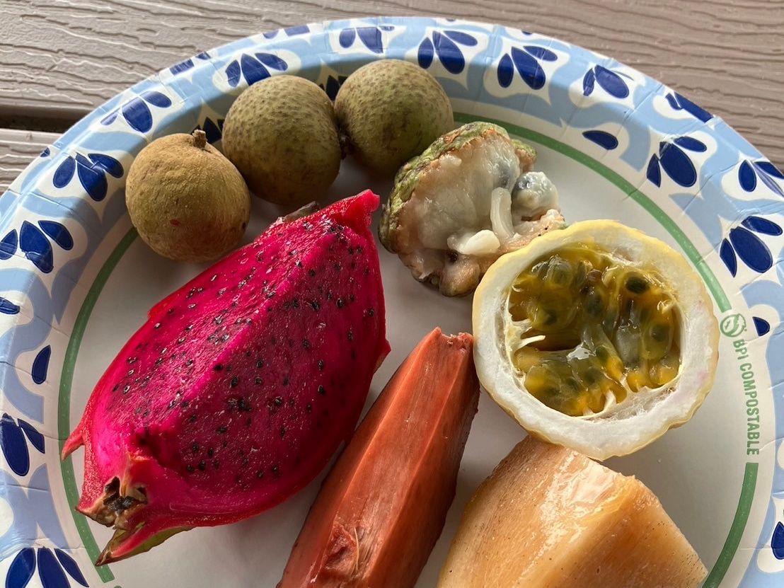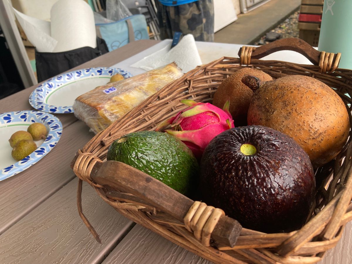 農園内を一巡りしたあとは、テーブルに着席してさらにフルーツ三昧が続きます。これでもかという量のこれまた珍しいフルーツを切っていただけます。時期によっていただけるフルーツは違うと思いますが、私たちが最後のシメにいただいたのはブラックサポーテという、まるでチョコレートのデザートのようなフルーツ。生クリームをたっぷりかけていただきました。