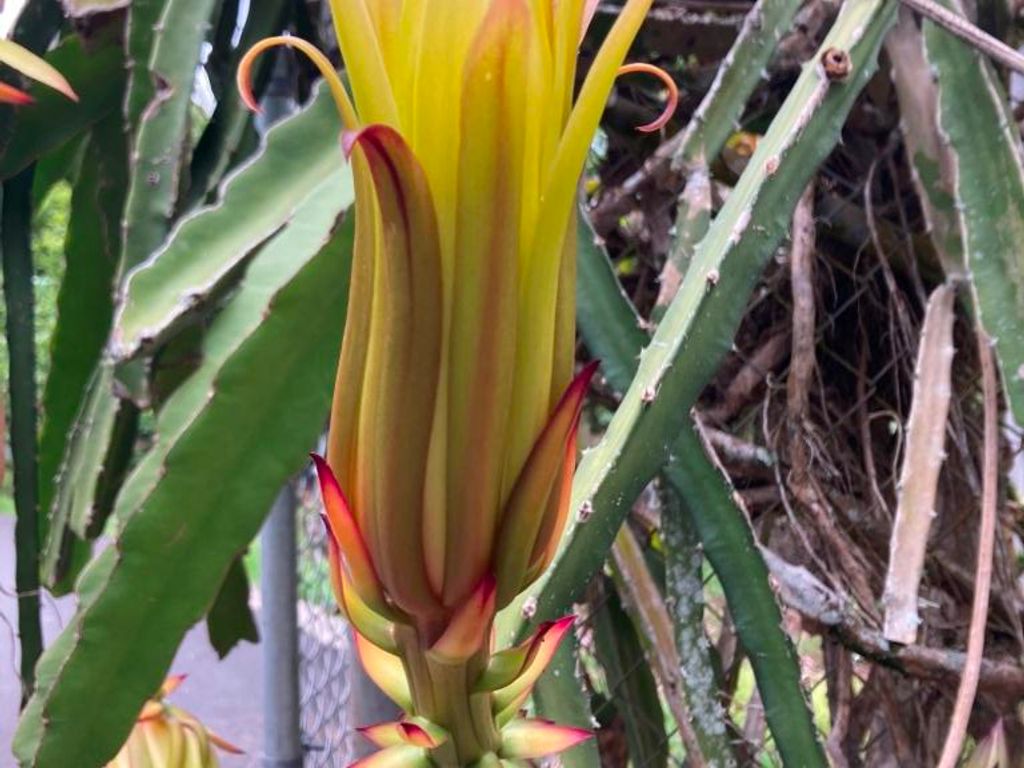 最後は、準備された果物を頂きました。ジャックフルーツ等々は初体験でした。種類もたくさんあったのですが、多くて忘れてしまいました。たまたま、農場入り口に月下美人が咲いており、その実がドラゴンフルーツみたいになることも聞きました。今回、いろんな話をして頂いた、ガイドの牧さん お世話になりました。フルーツの試食も良かったですが、カミさんのおばさんトークに付き合って頂き、こちらも感謝です。